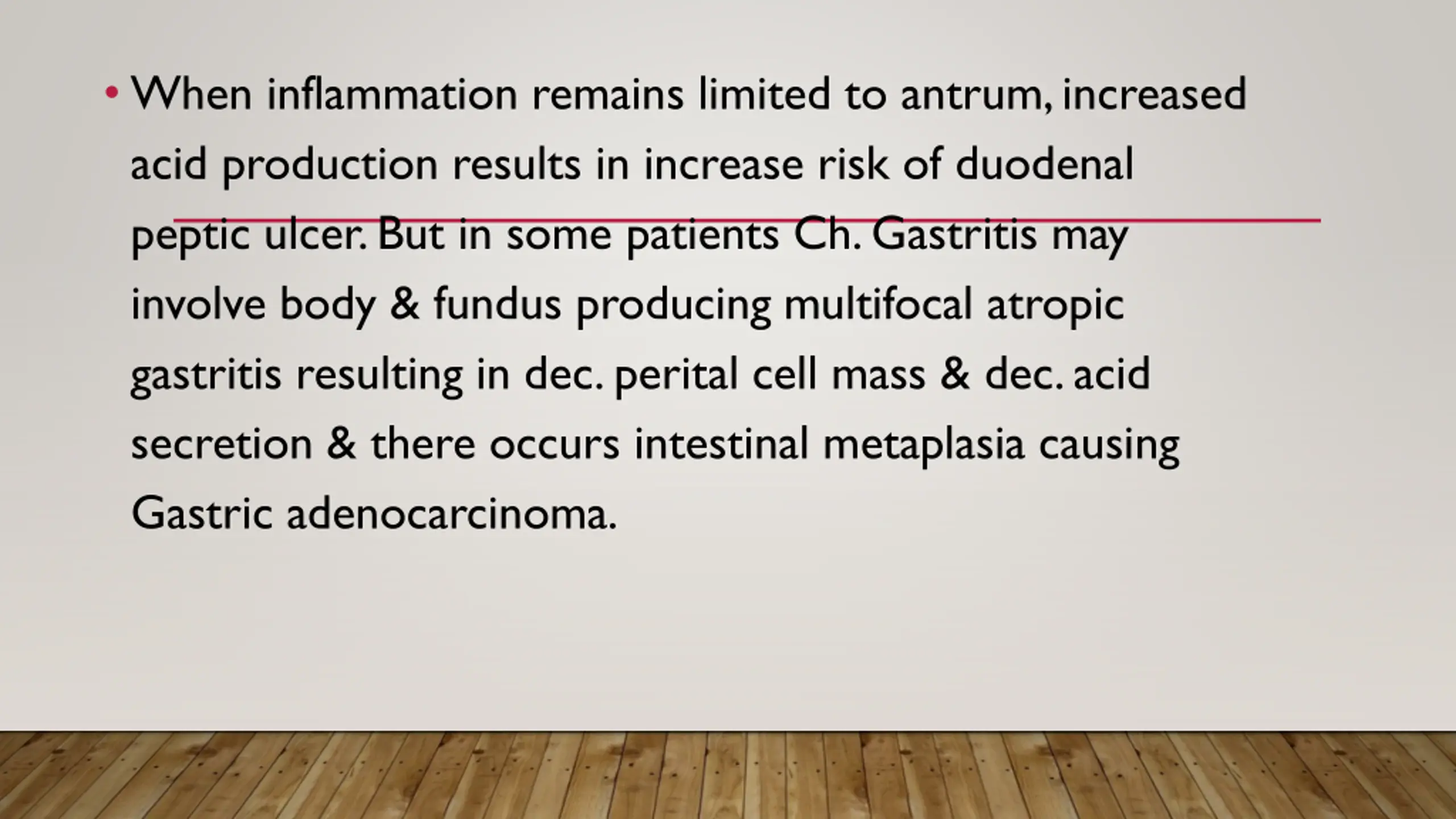 When inflammation remains limited to antrum, increased acid production results in increase risk of duodenal peptic ulcer. But in some patients Ch. Gastritis may involve body & fundus producing multifocal atropic gastritis resulting in dec. perital cell mass & dec. acid secretion & there occurs intestinal metaplasia causing Gastric adenocarcinoma.