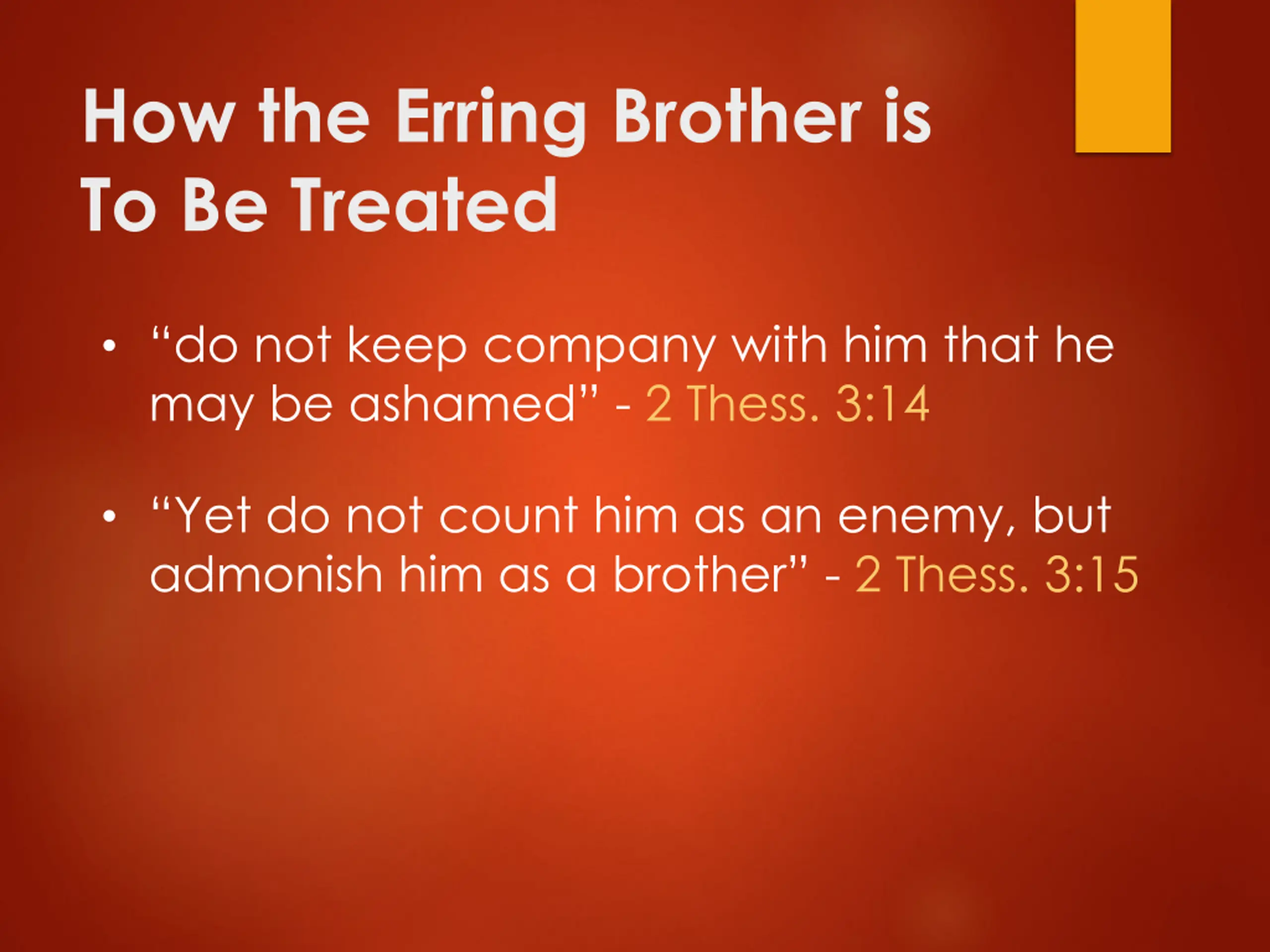 How the Erring Brother is To Be Treated do not keep company with him that he may be ashamed - 2 Thess. 3:14 Yet do not count him as an enemy, but admonish him as a brother - 2 Thess. 3:15