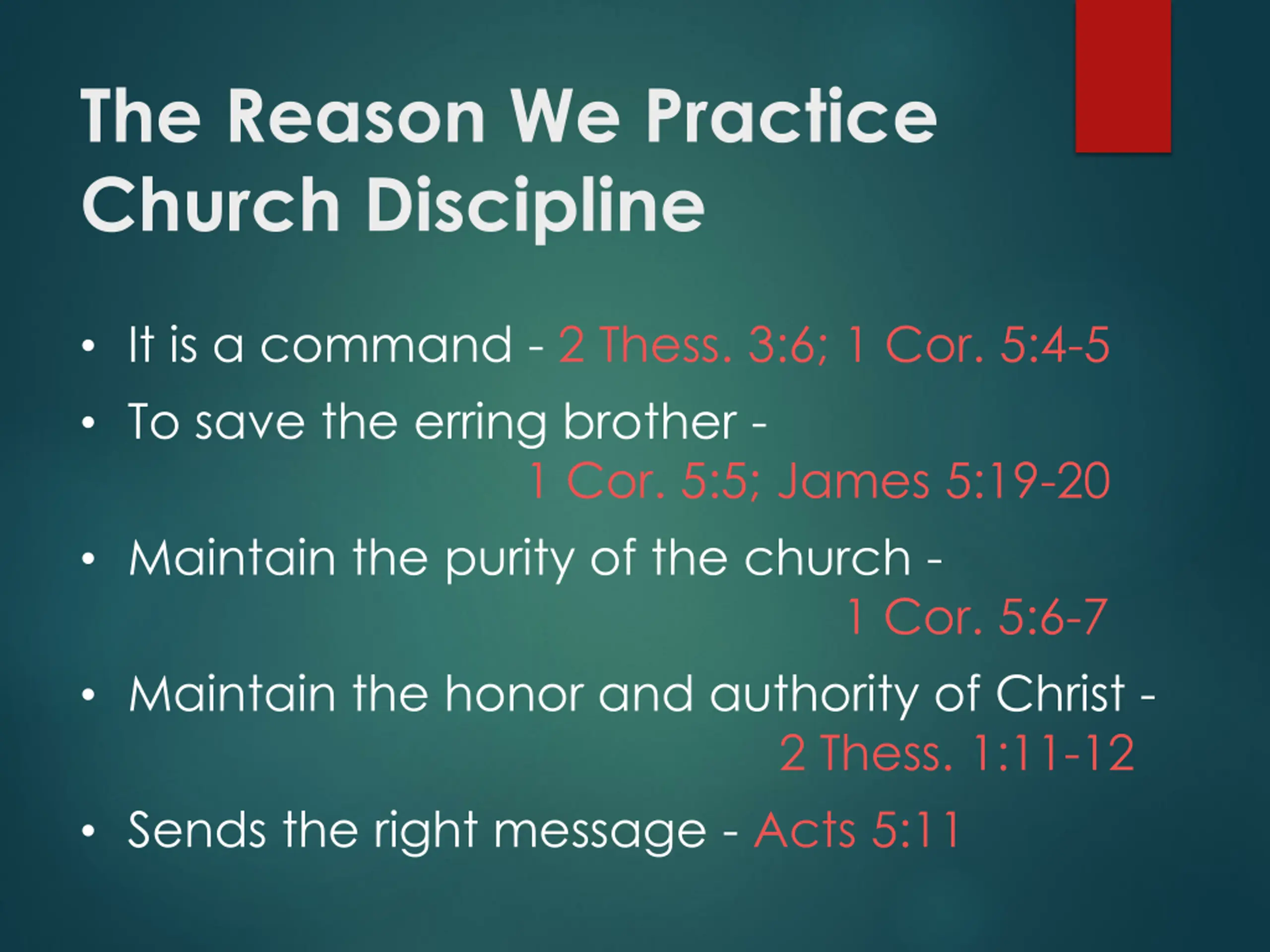 The Reason We Practice Church Discipline It is a command - 2 Thess. 3:6; 1 Cor. 5:4-5 To save the erring brother - 1 Cor. 5:5; James 5:19-20 Maintain the purity of the church - 1 Cor. 5:6-7 Maintain the honor and authority of Christ - 2 Thess. 1:11-12 Sends the right message - Acts 5:11