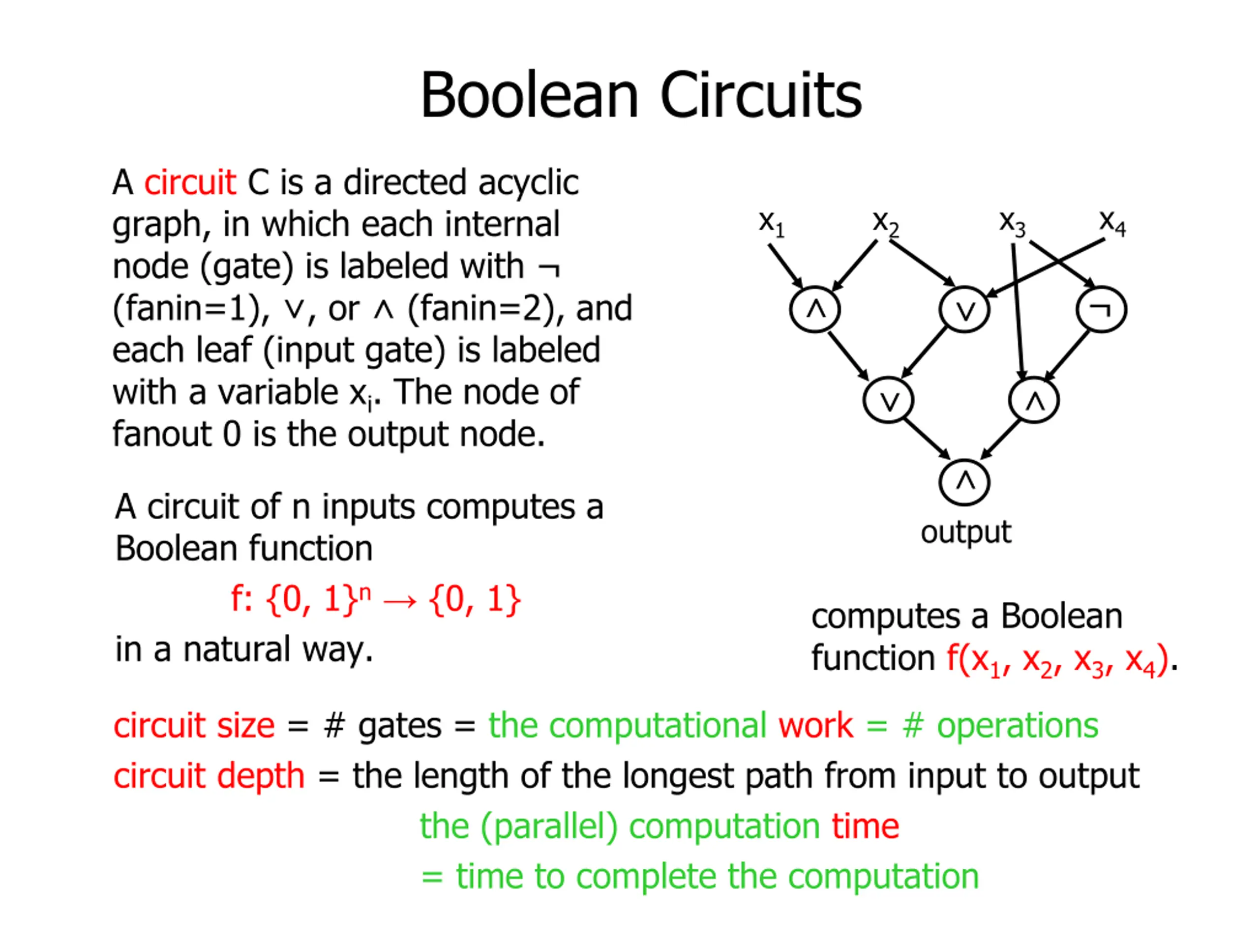 Boolean Circuits A circuit C is a directed acyclic graph, in which each internal node (gate) is labeled with (fanin=1), , or (fanin=2), and each leaf (input gate) is labeled with a variable xi. The node of fanout 0 is the output node. x4 x3 x1 x2 A circuit of n inputs computes a Boolean function f: {0, 1}n {0, 1} in a natural way. output computes a Boolean function f(x1, x2, x3, x4). circuit size = # gates = the computational work = # operations circuit depth = the length of the longest path from input to output the (parallel) computation time = time to complete the computation