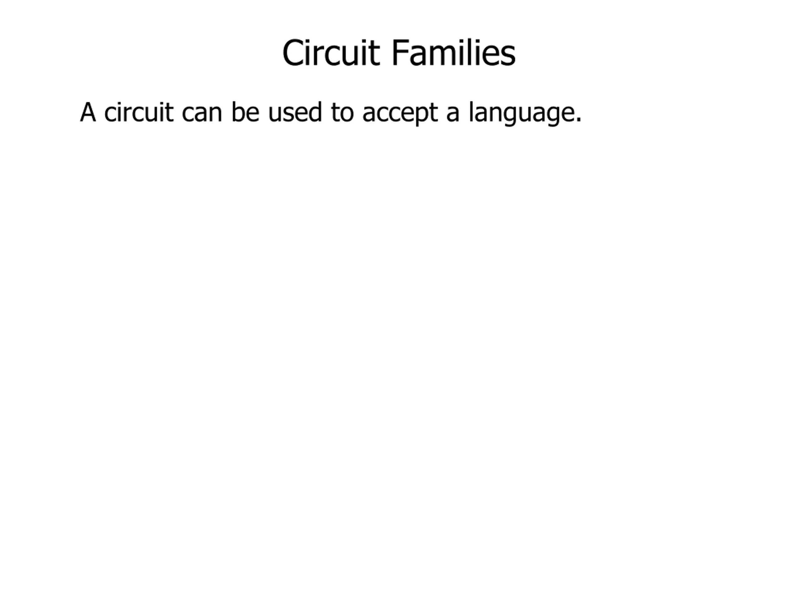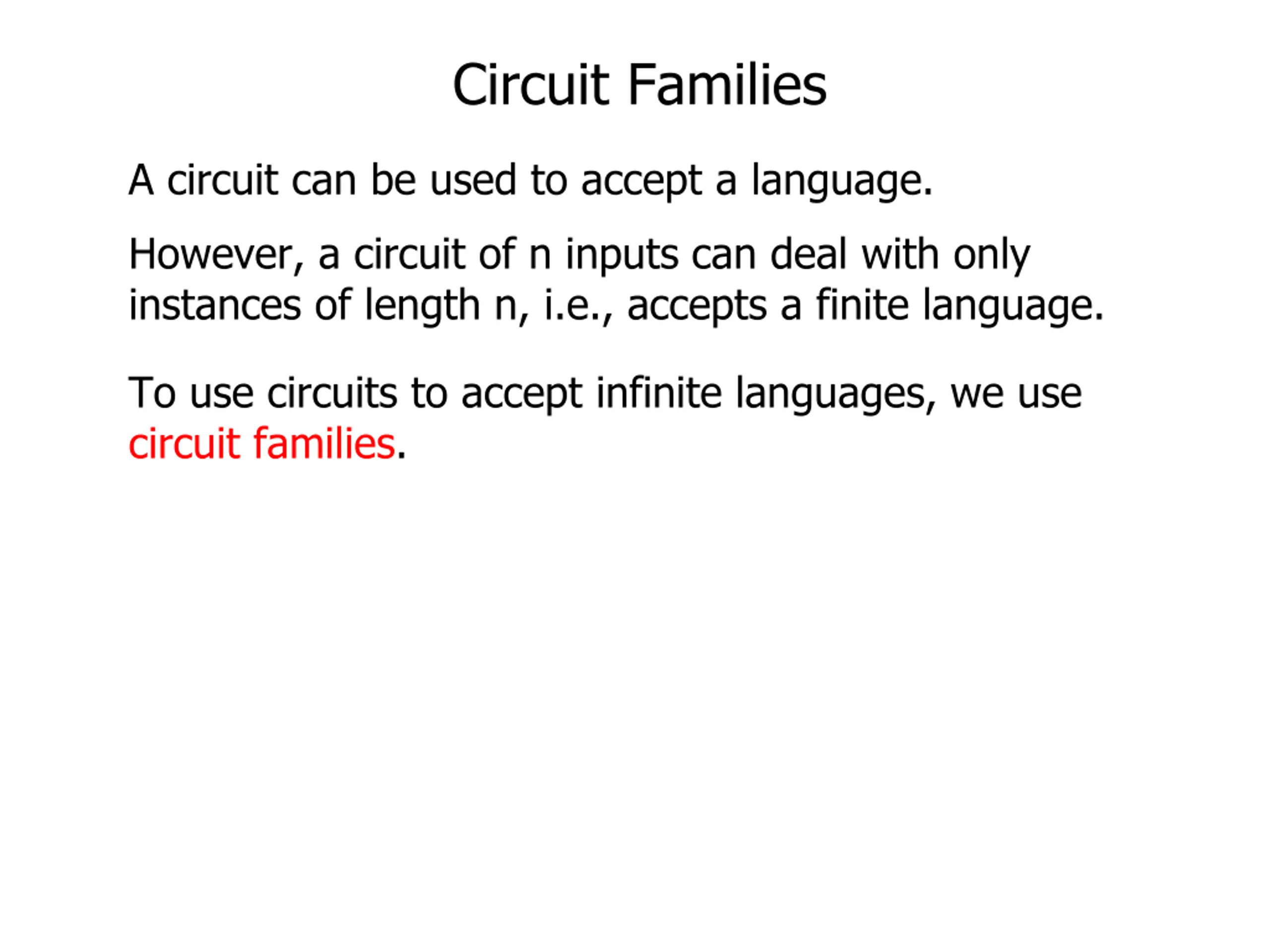 Circuit Families A circuit can be used to accept a language. However, a circuit of n inputs can deal with only instances of length n, i.e., accepts a finite language.
