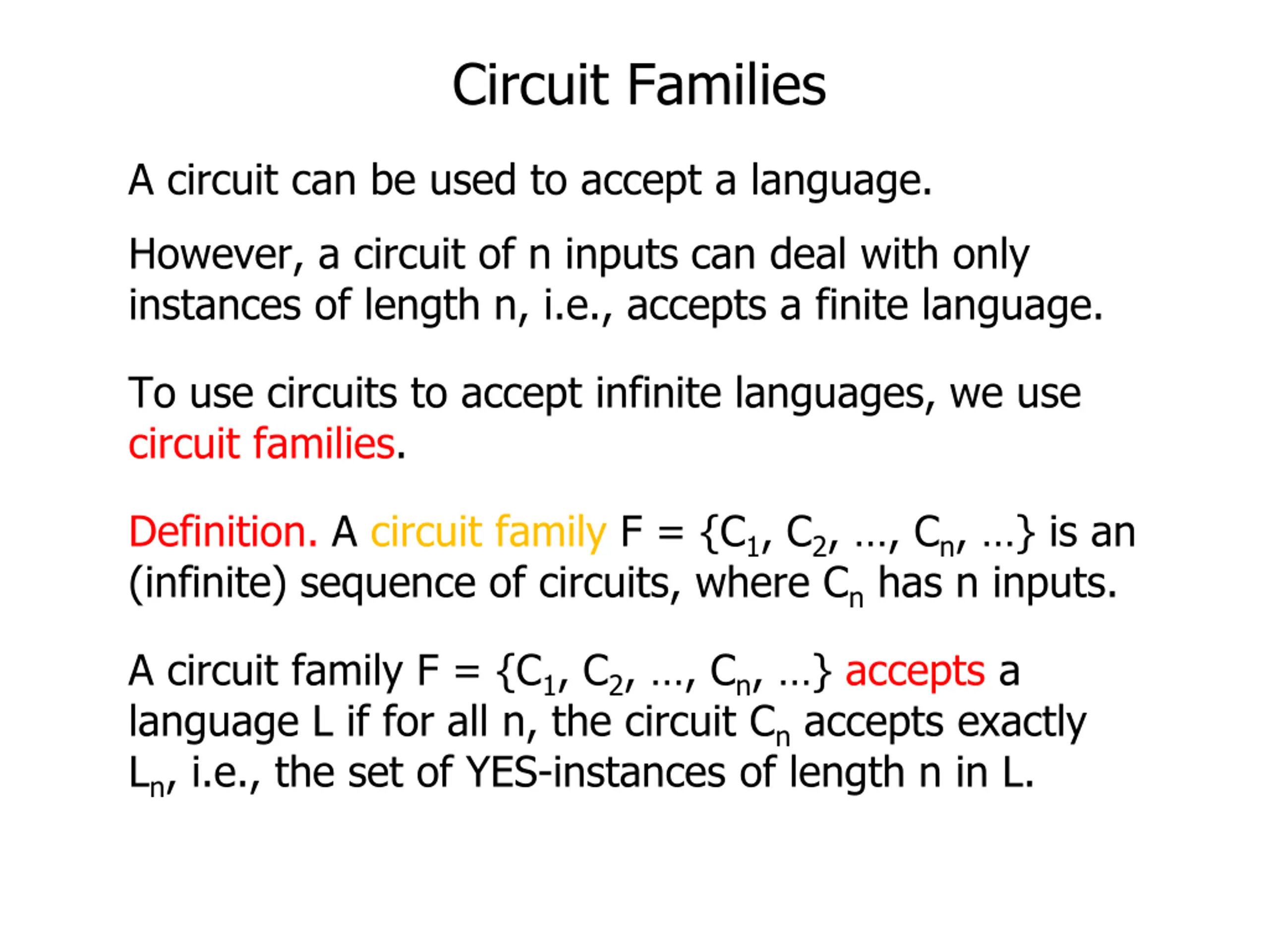 Circuit Families A circuit can be used to accept a language. However, a circuit of n inputs can deal with only instances of length n, i.e., accepts a finite language. To use circuits to accept infinite languages, we use circuit families. Definition. A circuit family F = {C1, C2, , Cn, } is an (infinite) sequence of circuits, where Cn has n inputs. A circuit family F = {C1, C2, , Cn, } accepts a language L if for all n, the circuit Cn accepts exactly Ln, i.e., the set of YES-instances of length n in L.