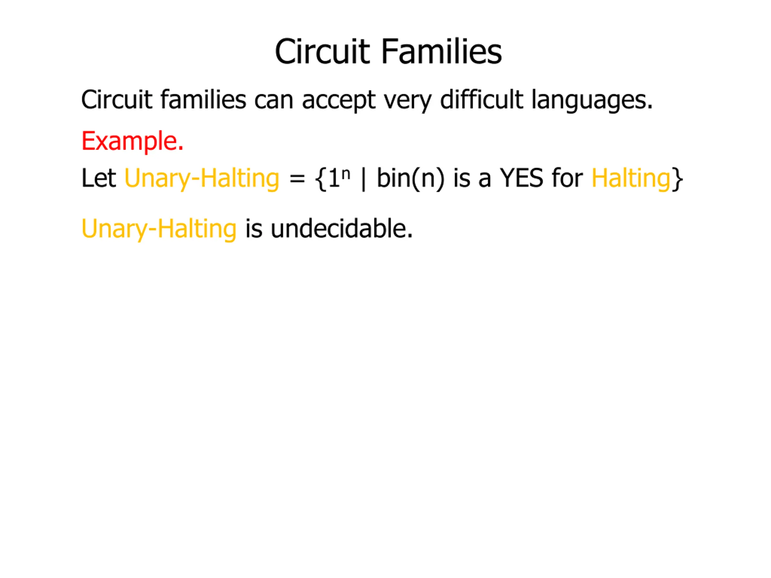 Circuit Families Circuit families can accept very difficult languages. Example. Let Unary-Halting = {1n | bin(n) is a YES for Halting} Unary-Halting is undecidable.
