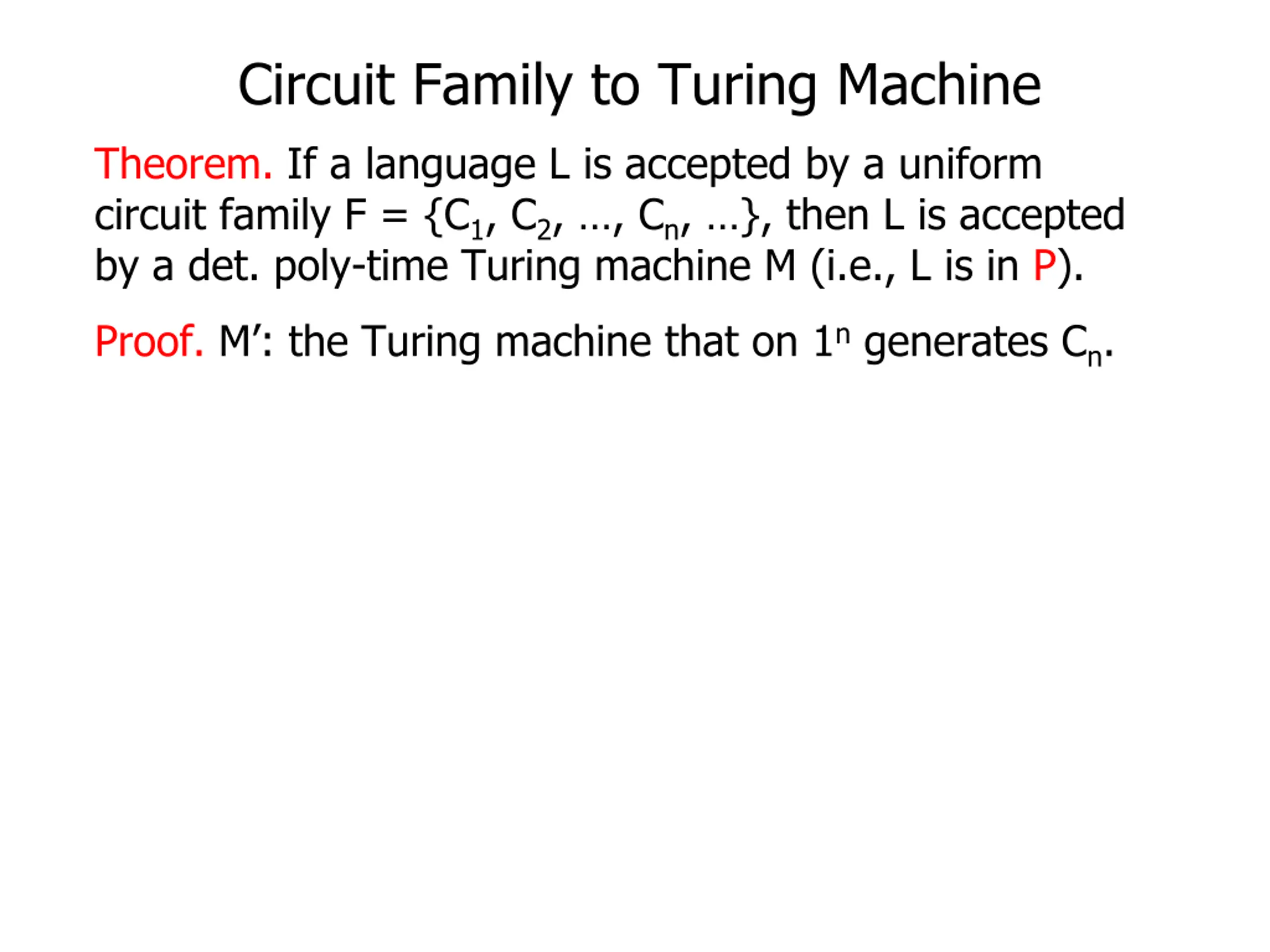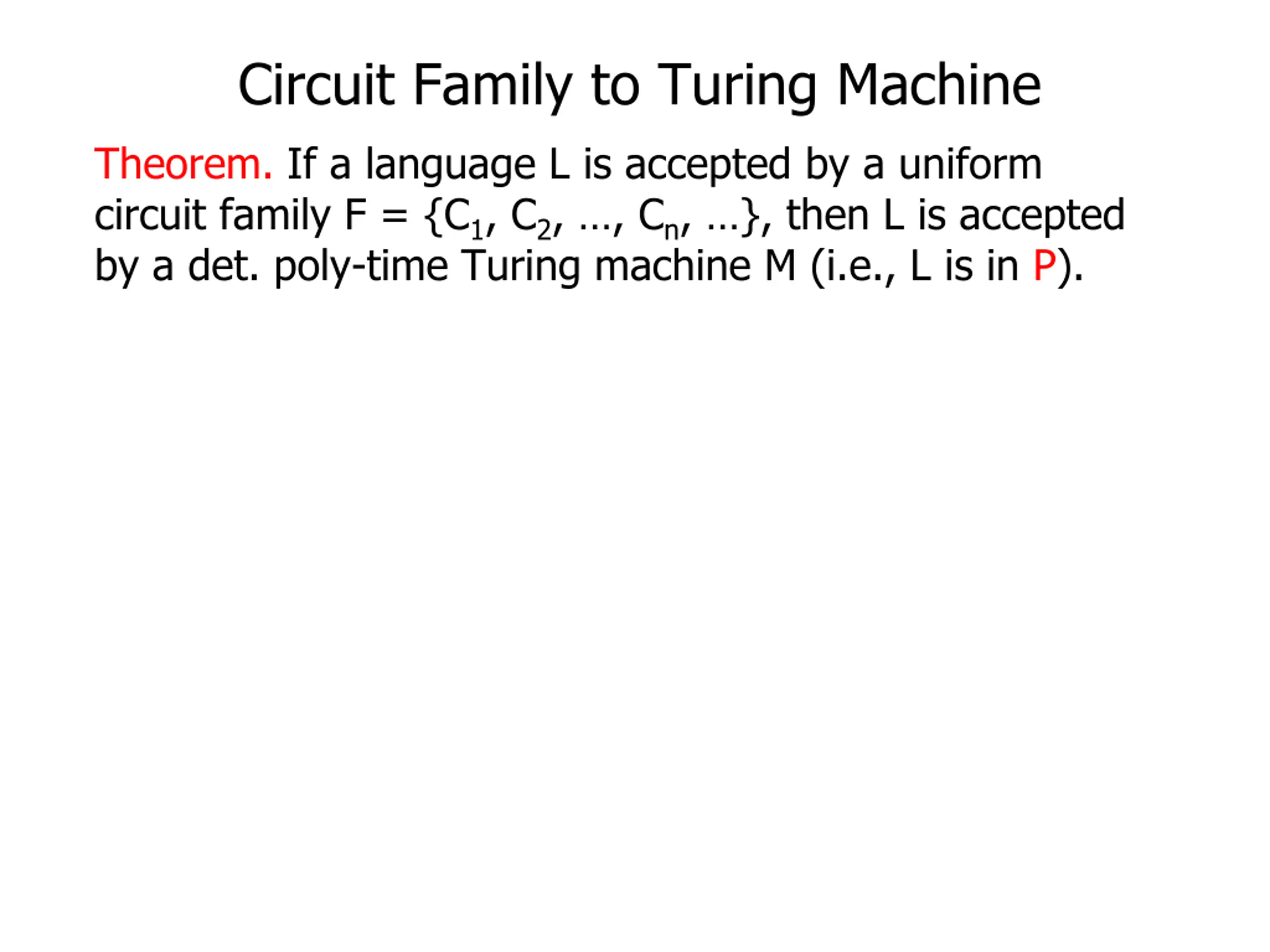 Circuit Family to Turing Machine Theorem. If a language L is accepted by a uniform circuit family F = {C1, C2, , Cn, }, then L is accepted by a det. poly-time Turing machine M (i.e., L is in P).
