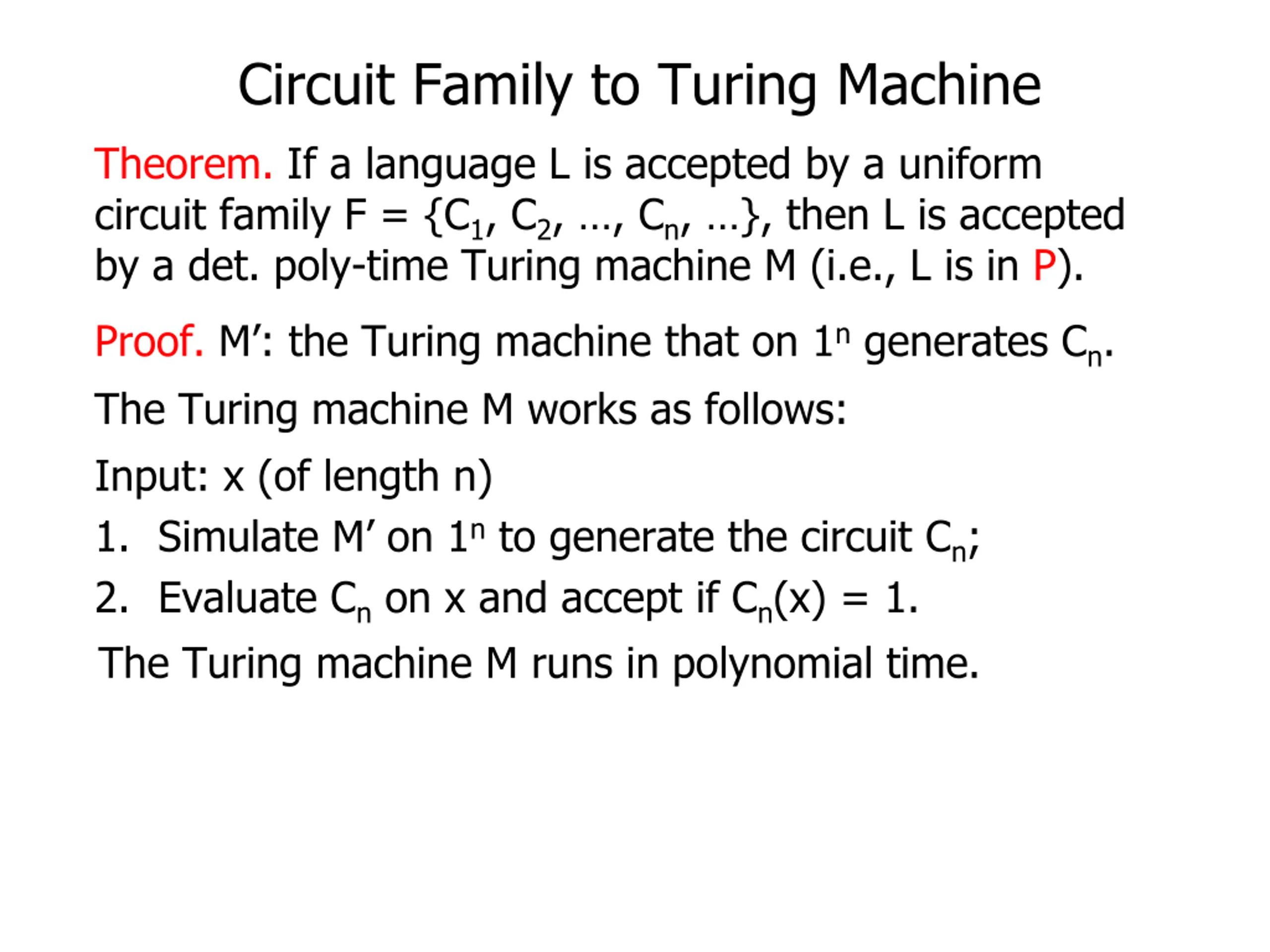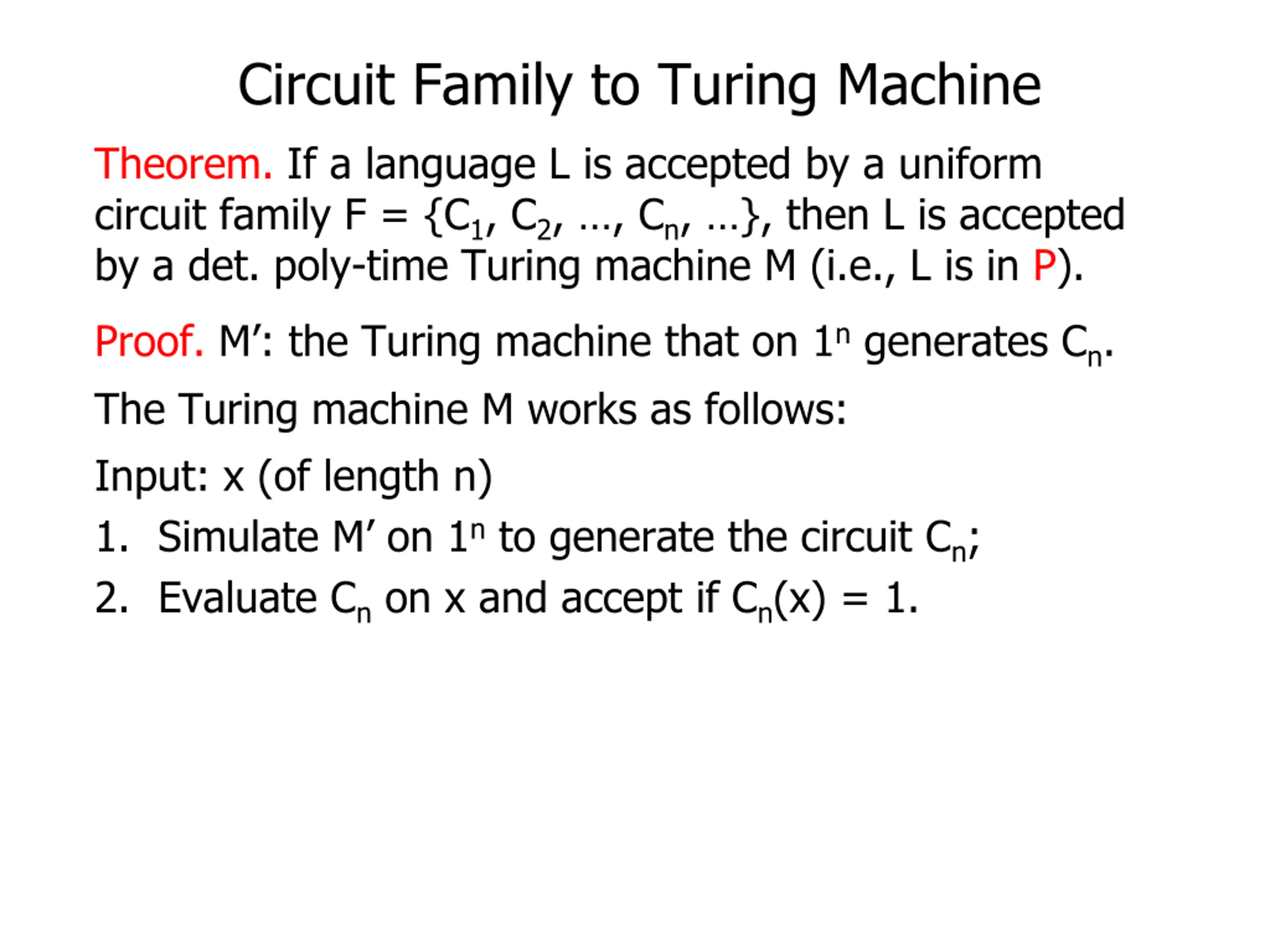 Circuit Family to Turing Machine Theorem. If a language L is accepted by a uniform circuit family F = {C1, C2, , Cn, }, then L is accepted by a det. poly-time Turing machine M (i.e., L is in P). Proof. M : the Turing machine that on 1n generates Cn. The Turing machine M works as follows: Input: x (of length n) 1. Simulate M on 1n to generate the circuit Cn; 2. Evaluate Cn on x and accept if Cn(x) = 1.