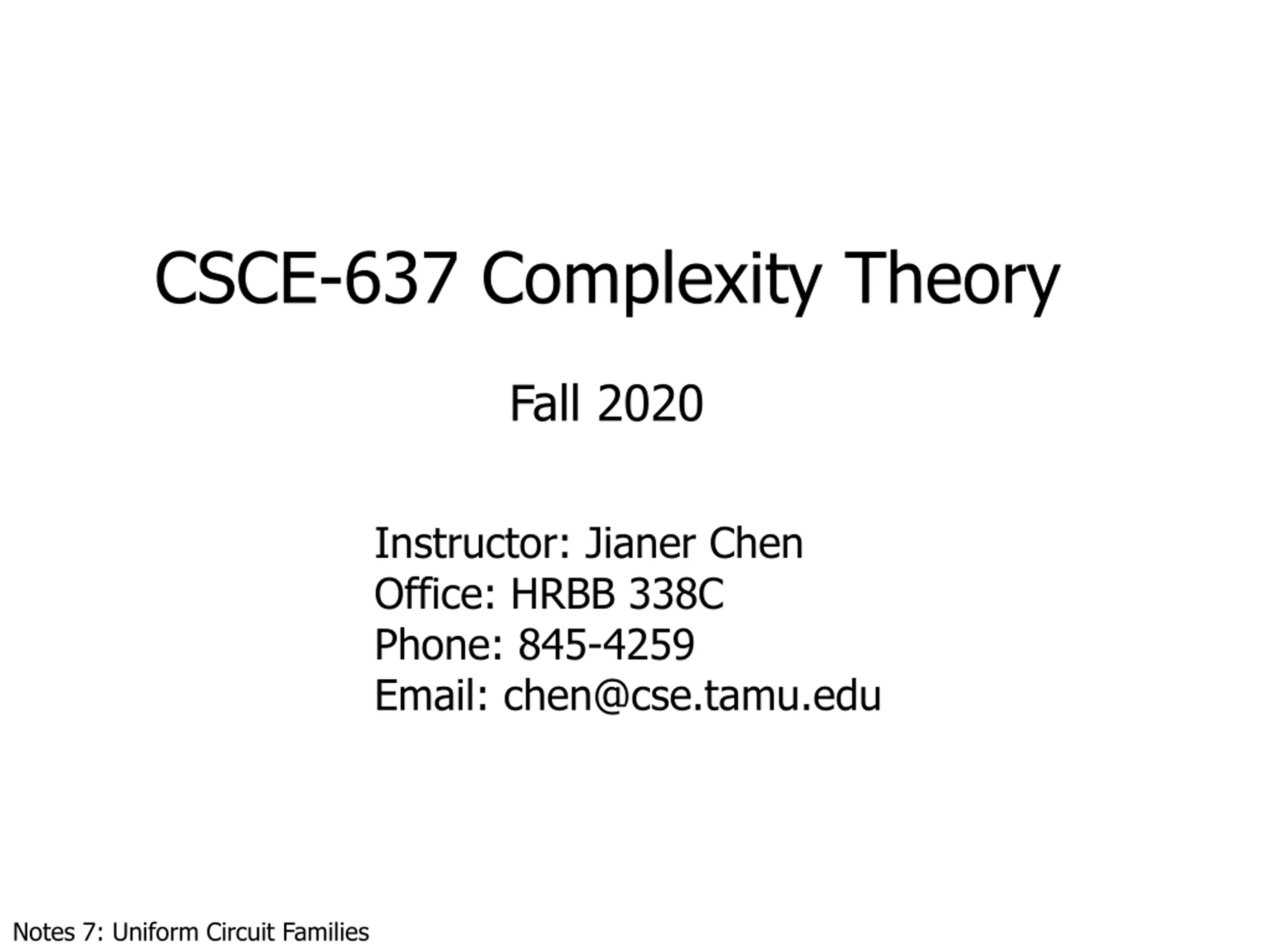 CSCE-637 Complexity Theory Fall 2020 Instructor: Jianer Chen Office: HRBB 338C Phone: 845-4259 Email: chen@cse.tamu.edu Notes 7: Uniform Circuit Families