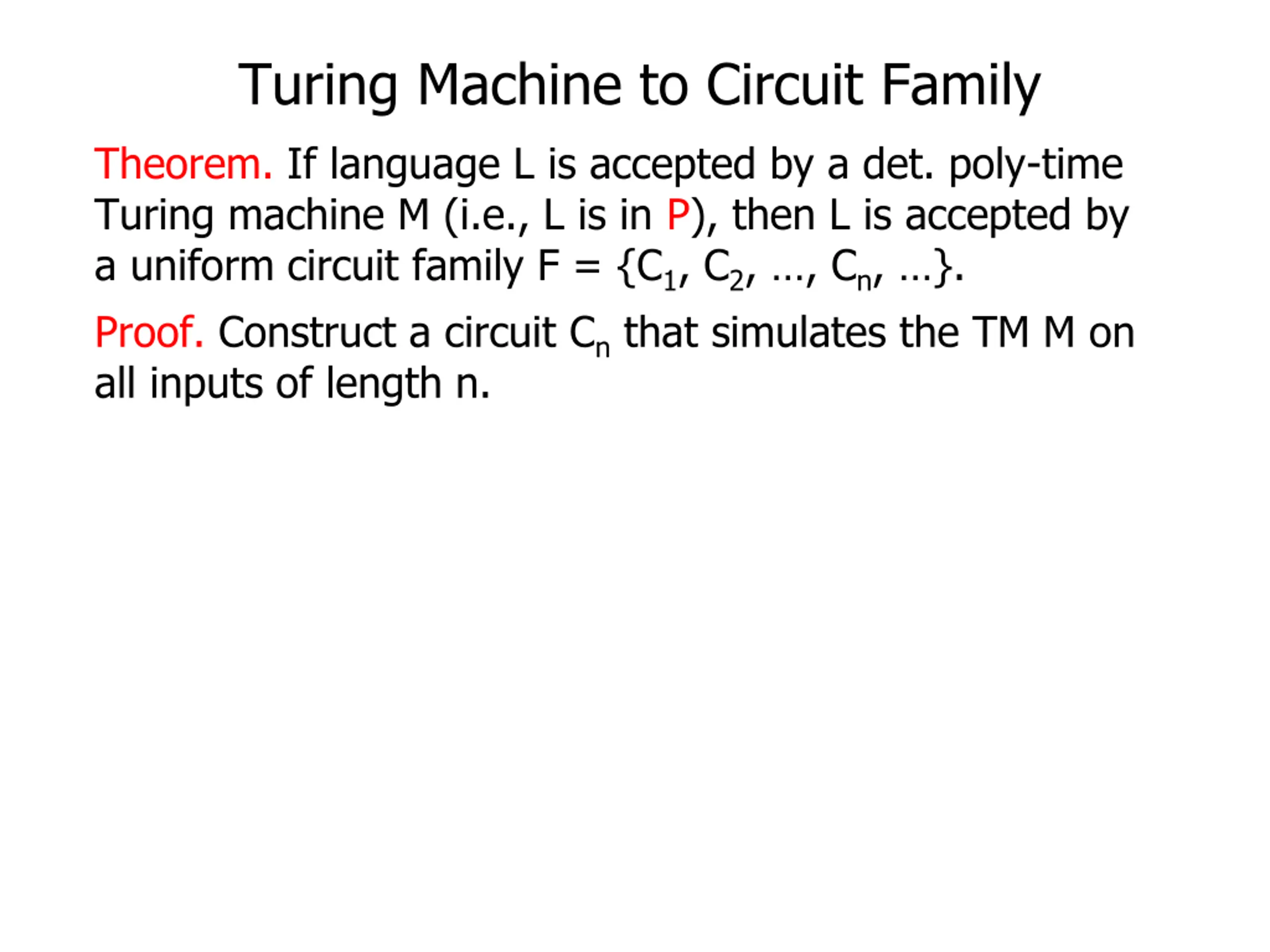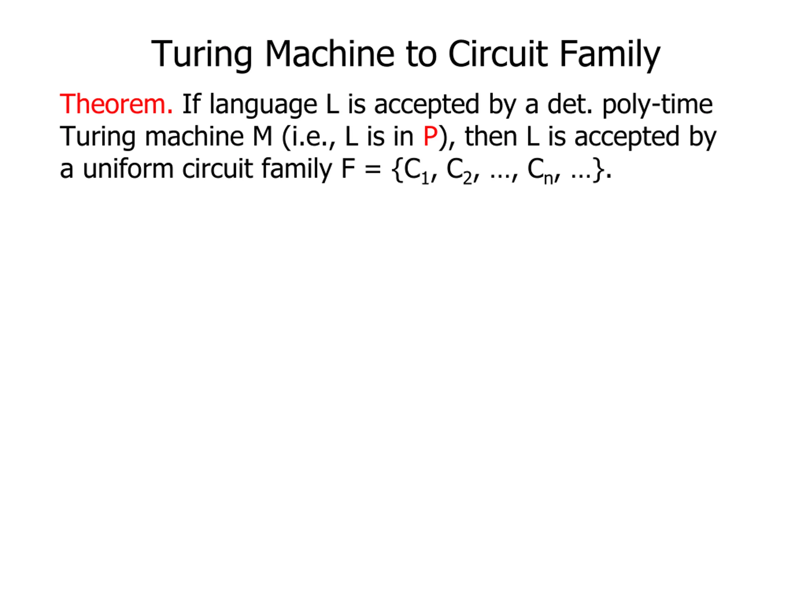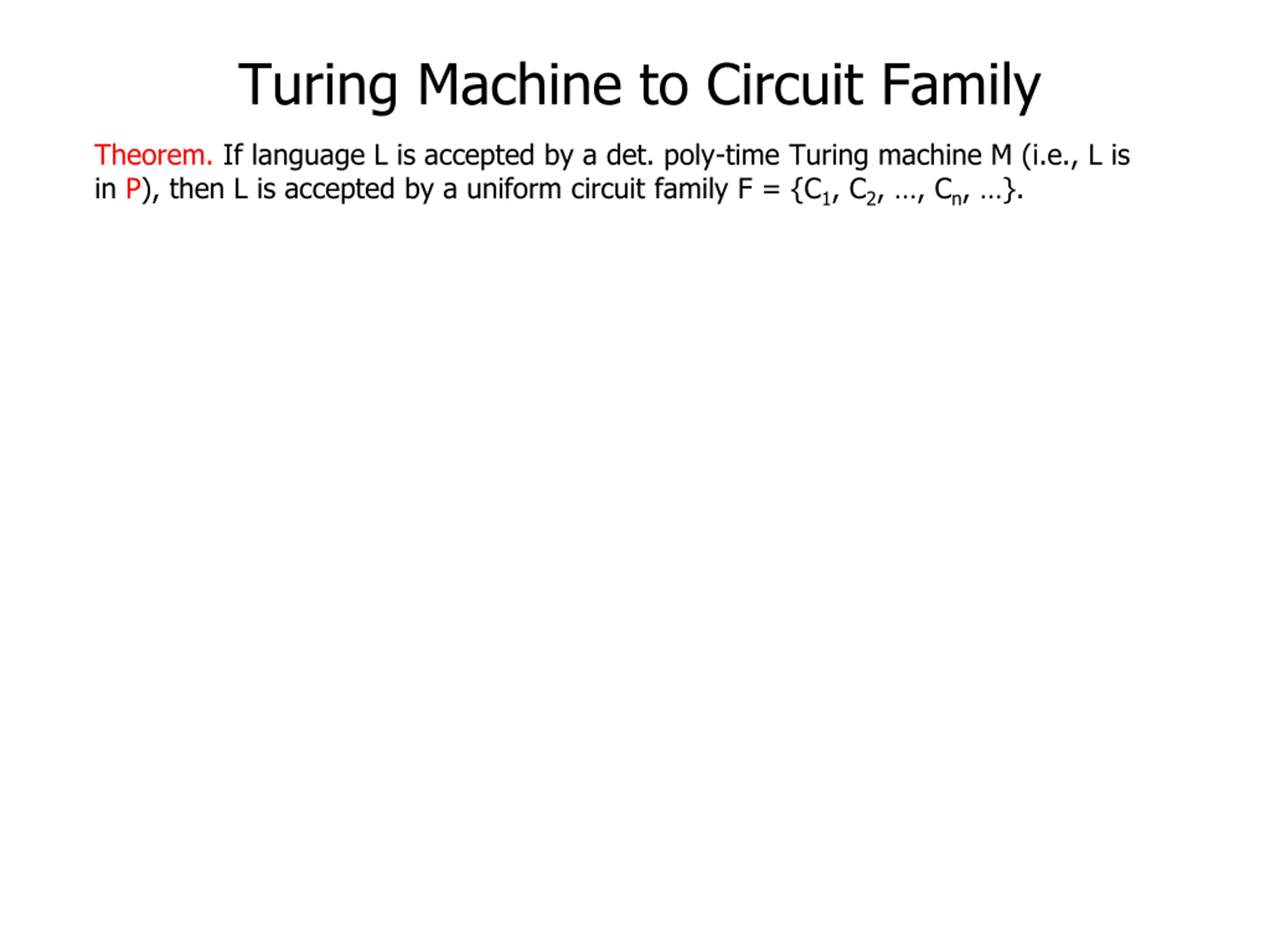 Turing Machine to Circuit Family Theorem. If language L is accepted by a det. poly-time Turing machine M (i.e., L is in P), then L is accepted by a uniform circuit family F = {C1, C2, , Cn, }.