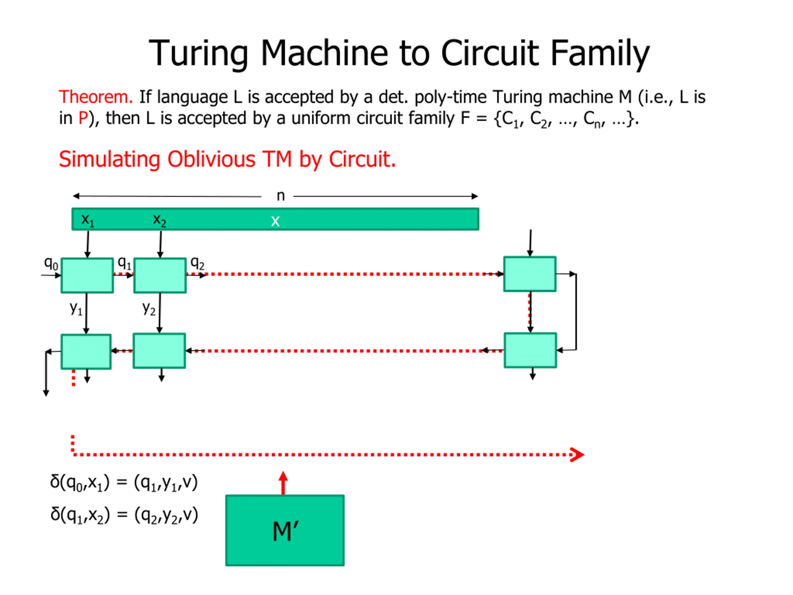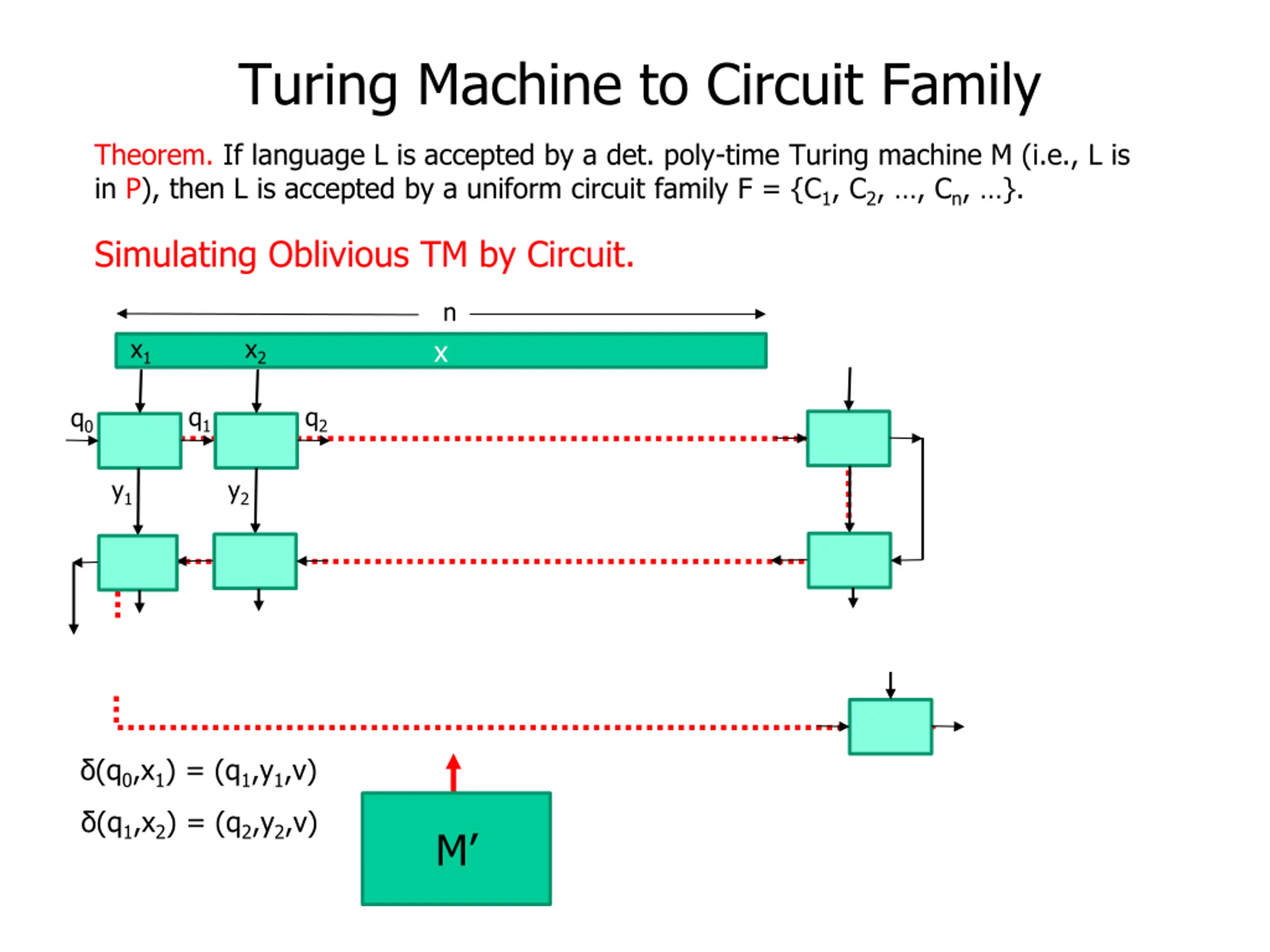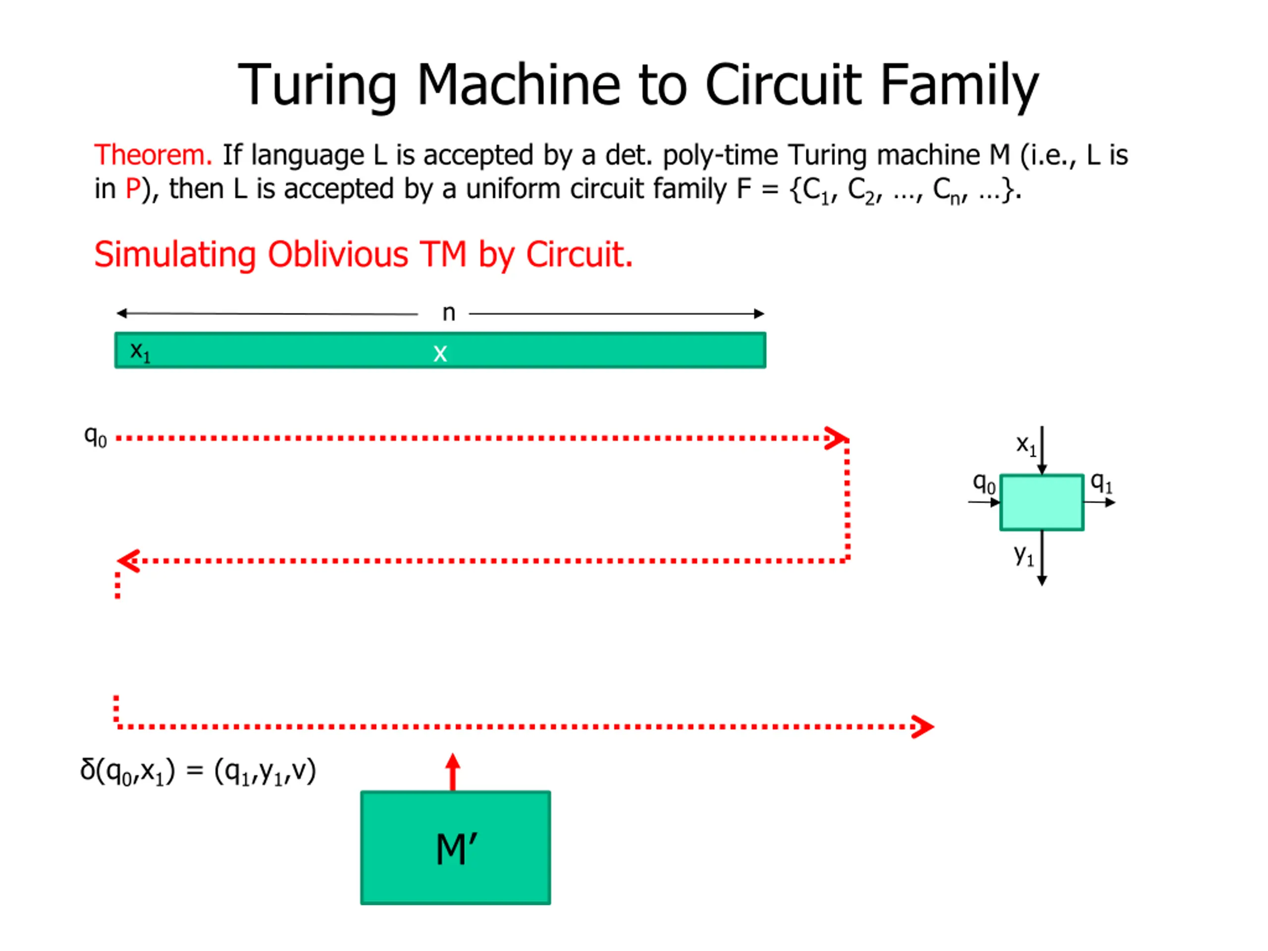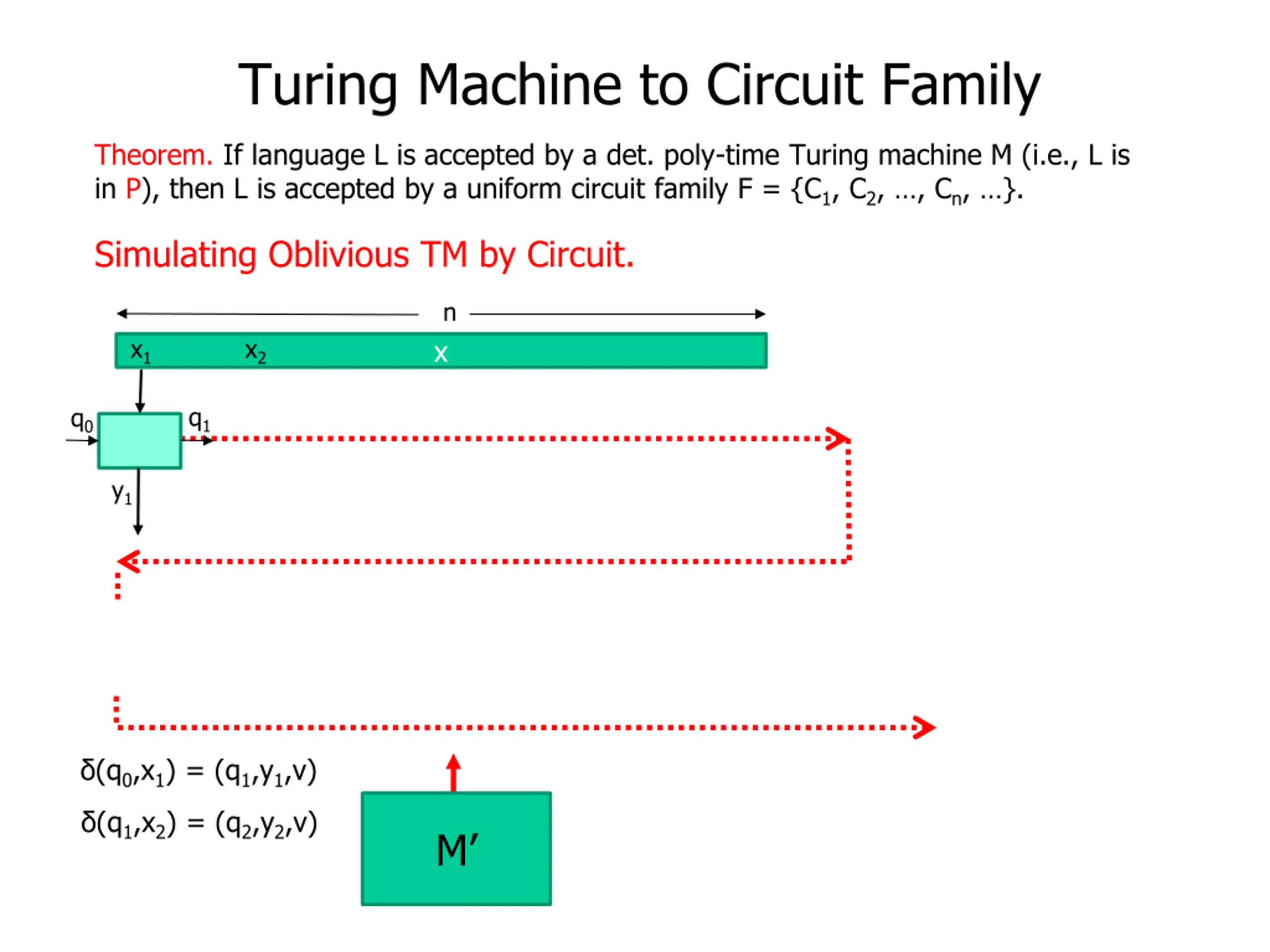 Turing Machine to Circuit Family Theorem. If language L is accepted by a det. poly-time Turing machine M (i.e., L is in P), then L is accepted by a uniform circuit family F = {C1, C2, , Cn, }. Simulating Oblivious TM by Circuit. n x1 x q0 x1 q1 q0 y1 (q0,x1) = (q1,y1,v) M