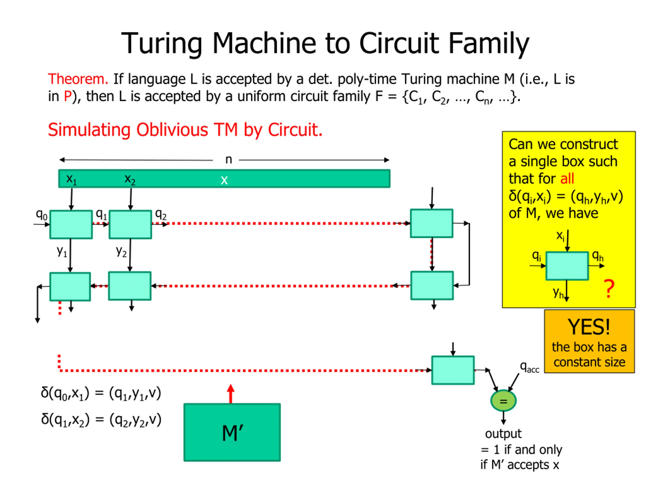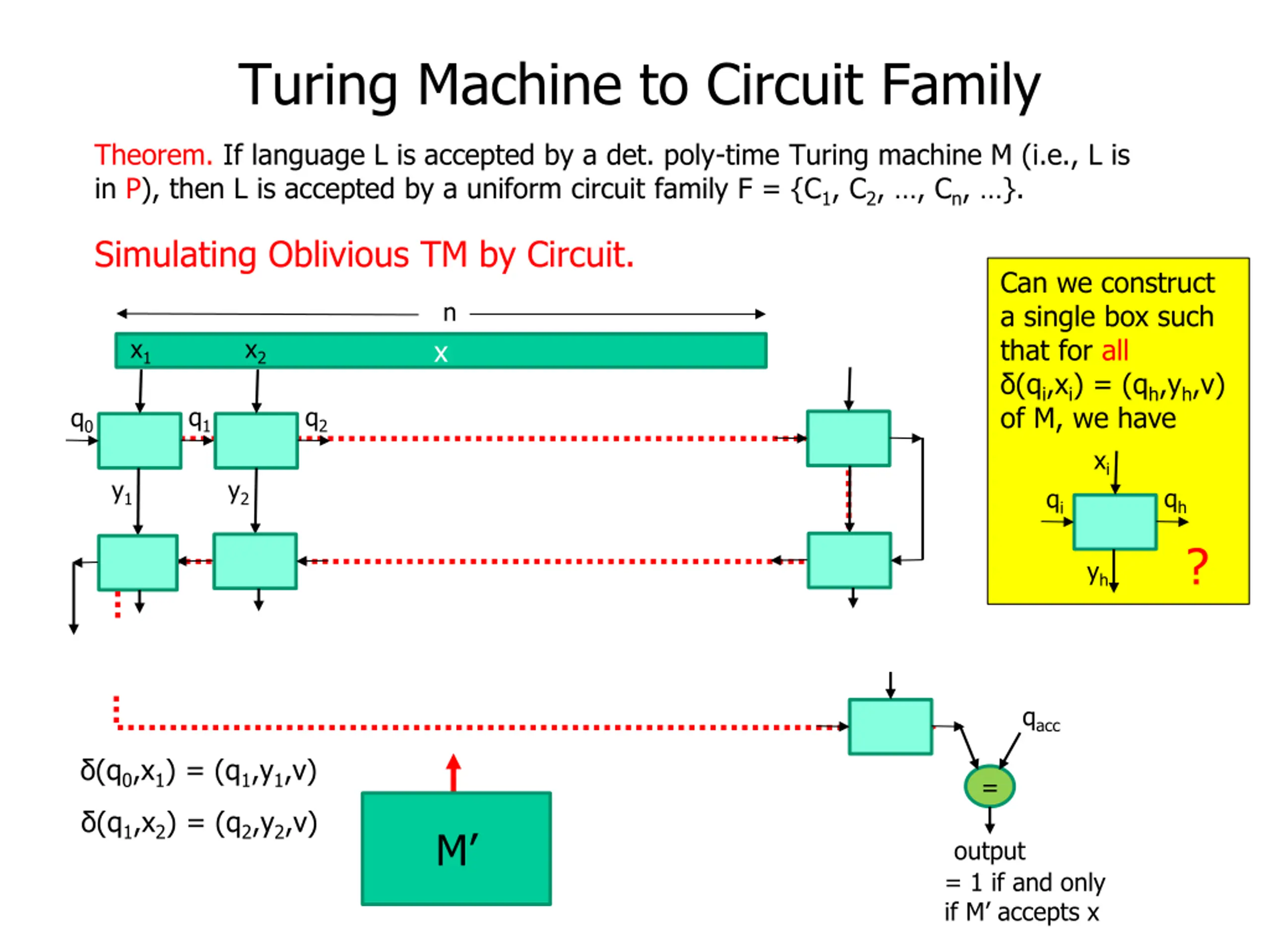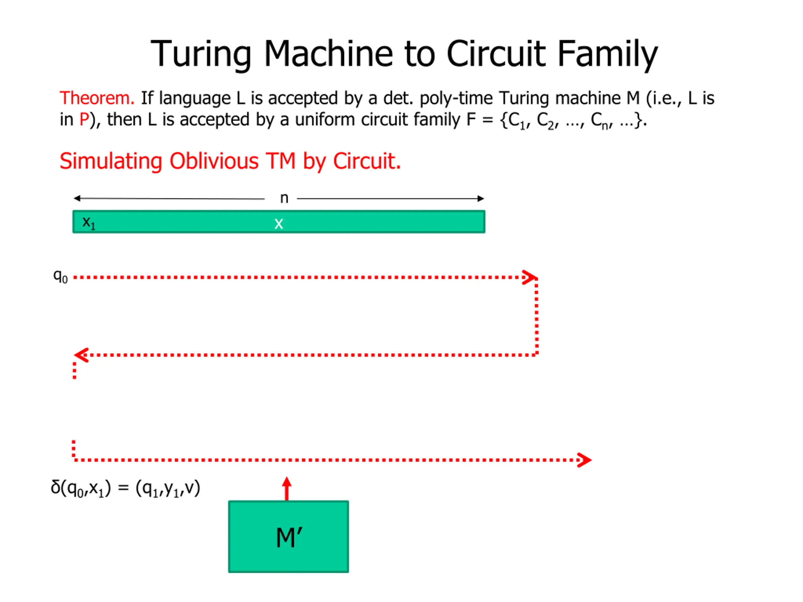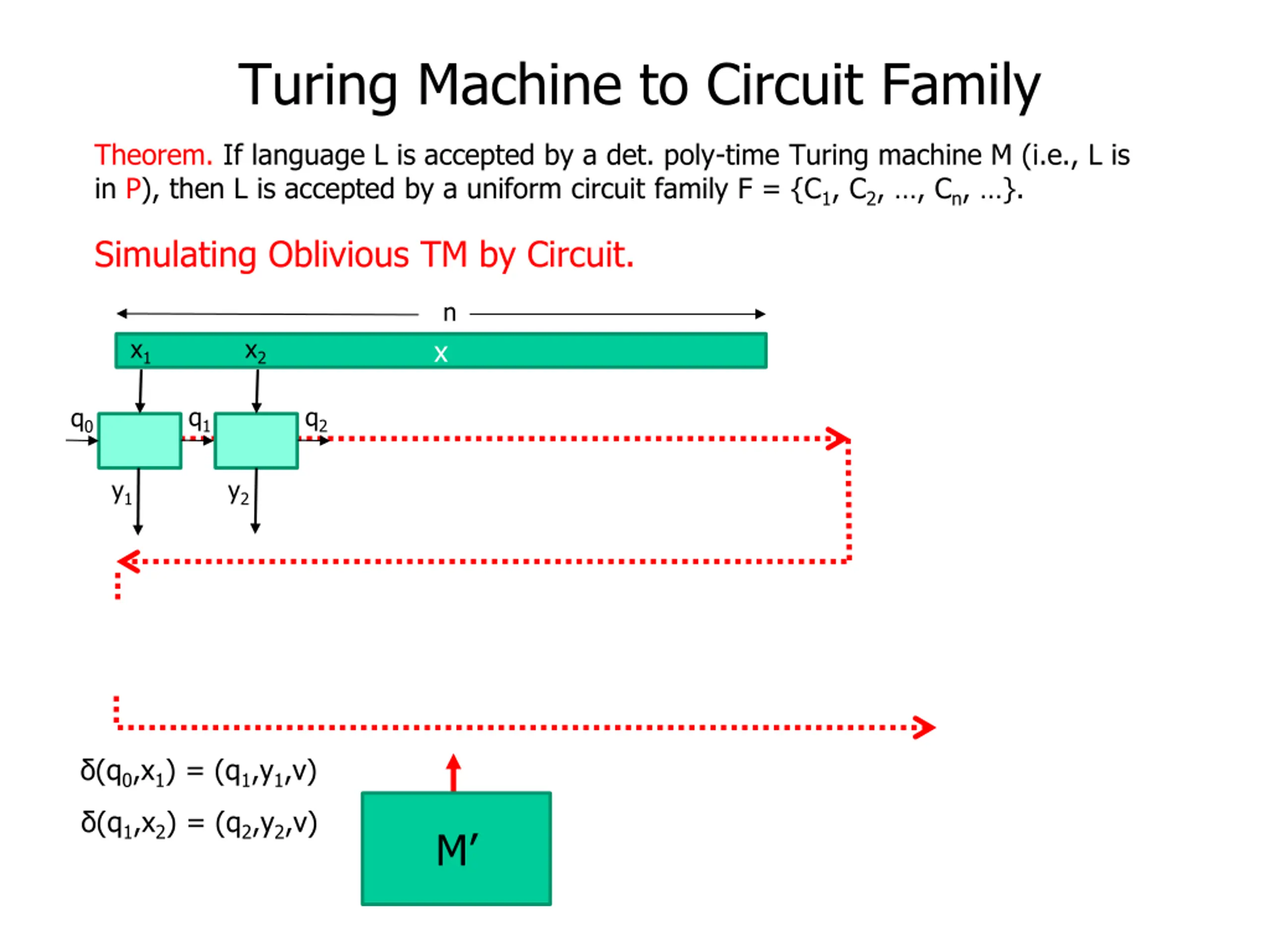 Turing Machine to Circuit Family Theorem. If language L is accepted by a det. poly-time Turing machine M (i.e., L is in P), then L is accepted by a uniform circuit family F = {C1, C2, , Cn, }. Simulating Oblivious TM by Circuit. n x1 x q0 x1 q1 q0 y1 (q0,x1) = (q1,y1,v) M