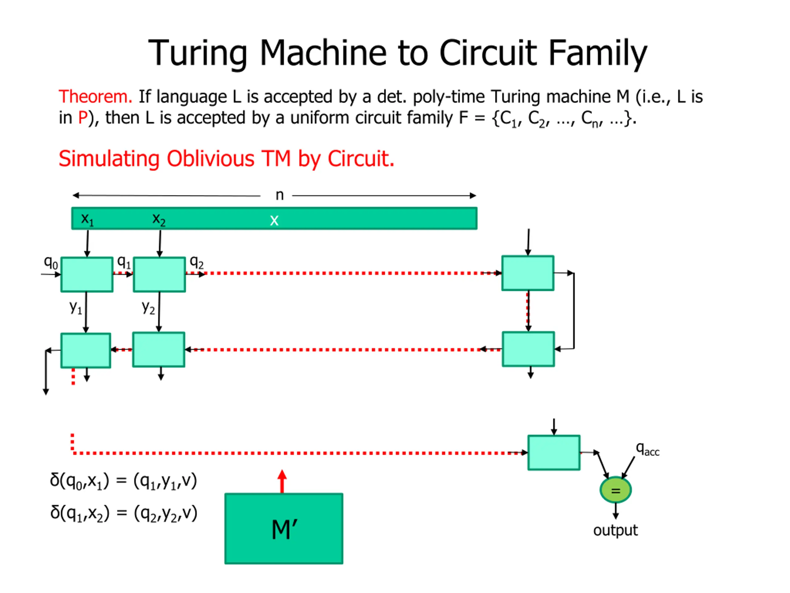 Turing Machine to Circuit Family Theorem. If language L is accepted by a det. poly-time Turing machine M (i.e., L is in P), then L is accepted by a uniform circuit family F = {C1, C2, , Cn, }. Simulating Oblivious TM by Circuit. n x1 x2 x q1 q2 q0 y1 y2 qacc (q0,x1) = (q1,y1,v) (q1,x2) = (q2,y2,v) = M output