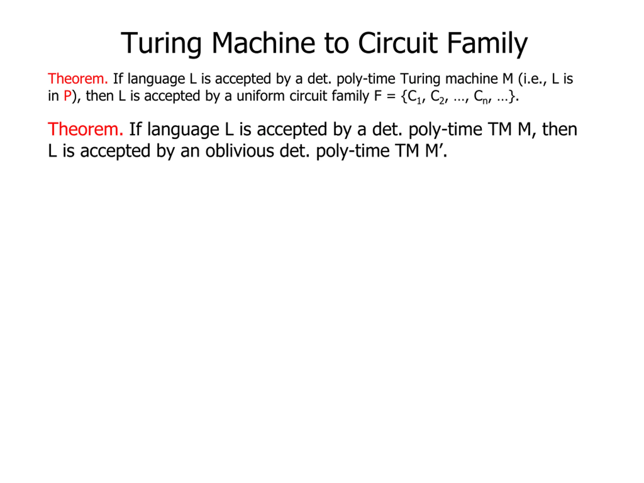 Turing Machine to Circuit Family Theorem. If language L is accepted by a det. poly-time Turing machine M (i.e., L is in P), then L is accepted by a uniform circuit family F = {C1, C2, , Cn, }. Theorem. If language L is accepted by a det. poly-time TM M, then L is accepted by an oblivious det. poly-time TM M .