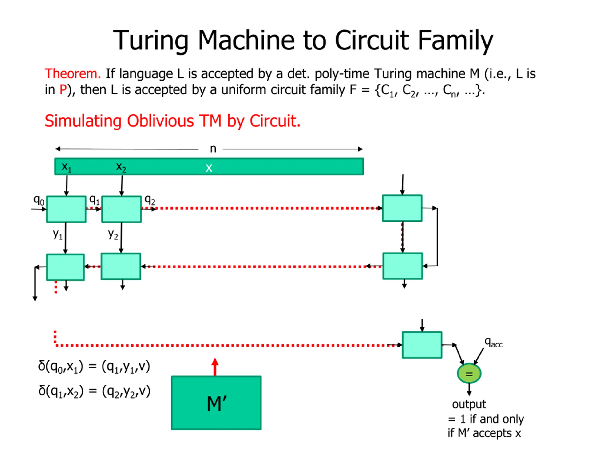 Turing Machine to Circuit Family Theorem. If language L is accepted by a det. poly-time Turing machine M (i.e., L is in P), then L is accepted by a uniform circuit family F = {C1, C2, , Cn, }. Simulating Oblivious TM by Circuit. n x1 x2 x q1 q0 y1 (q0,x1) = (q1,y1,v) (q1,x2) = (q2,y2,v) M