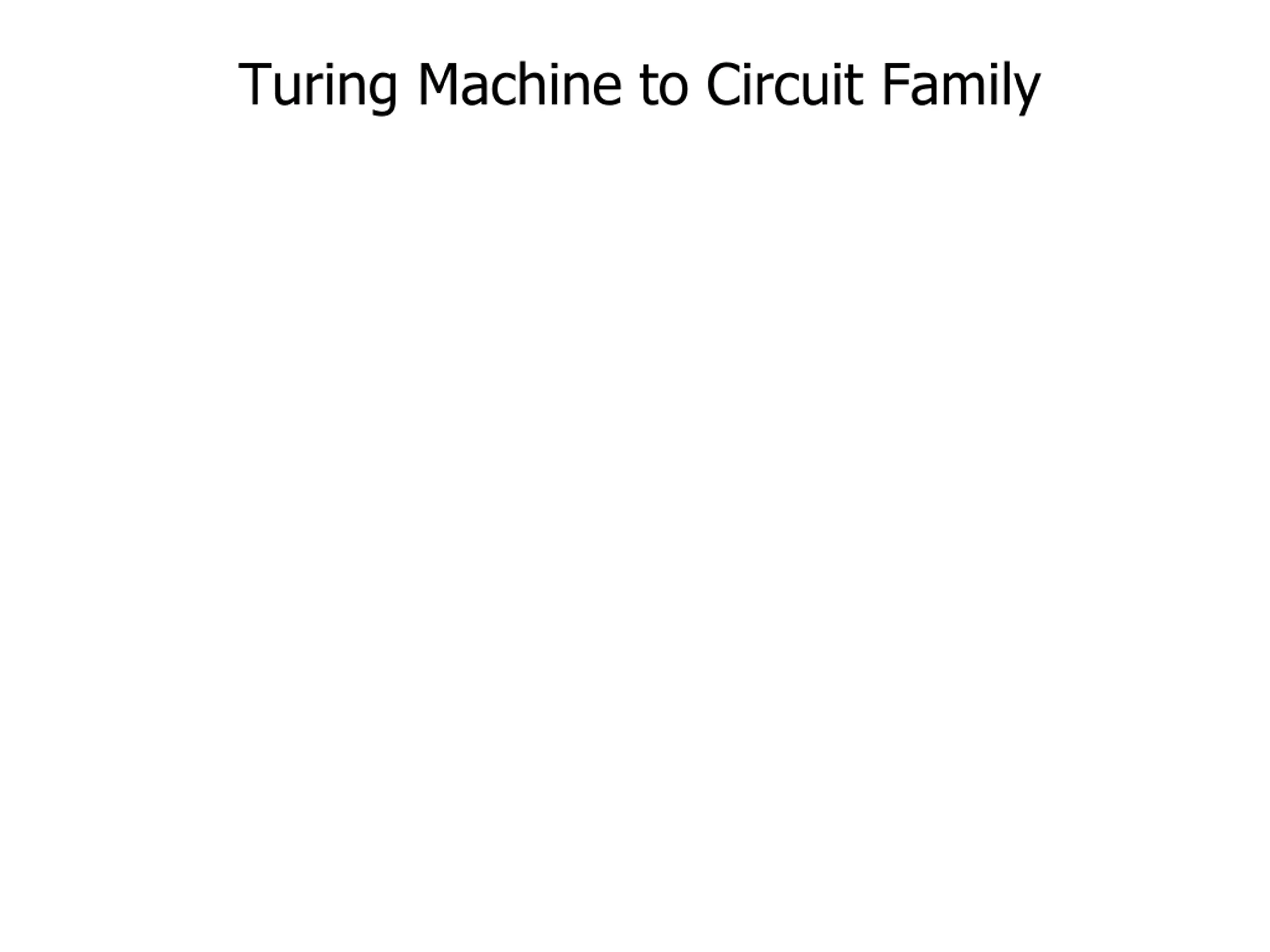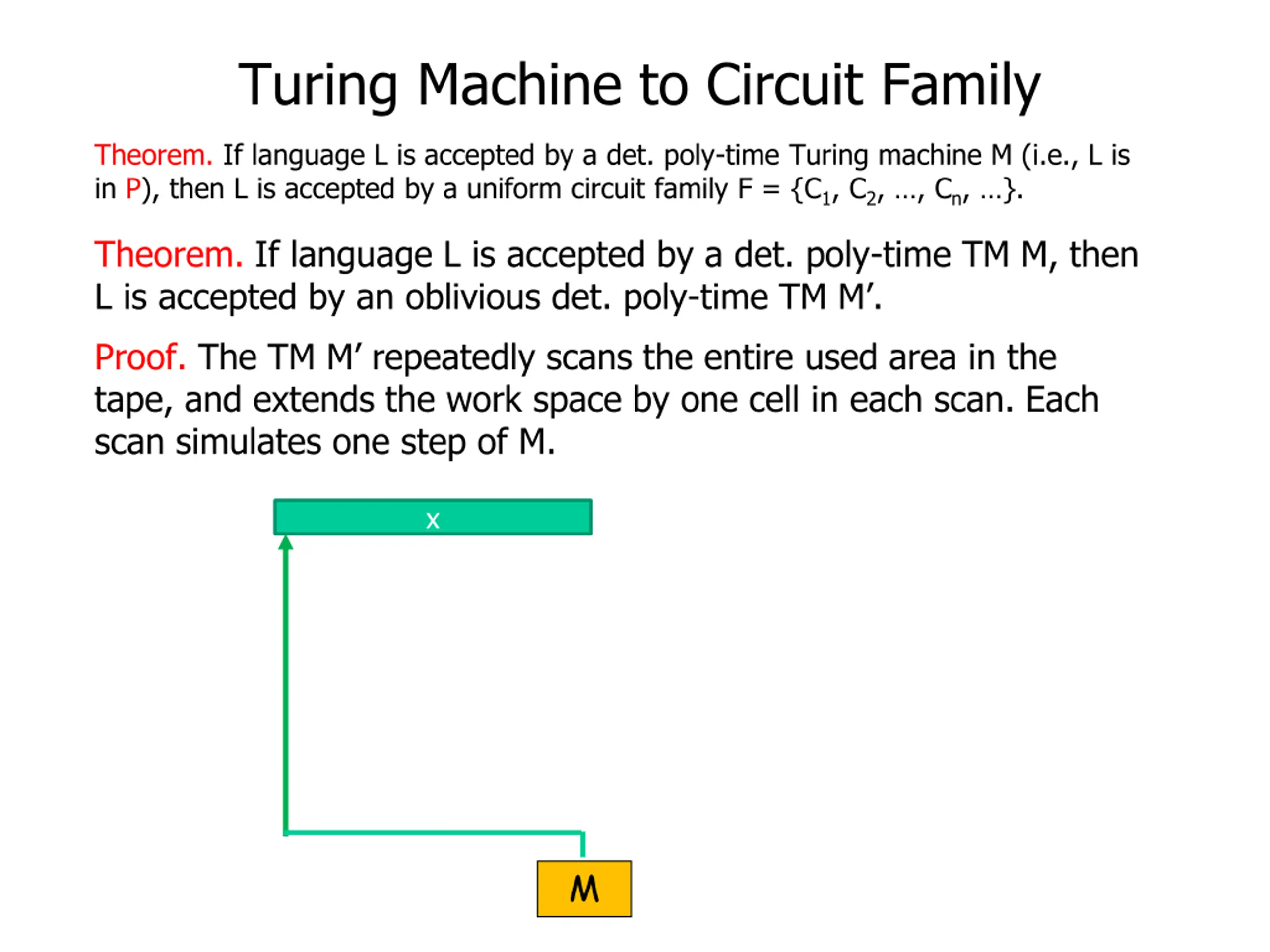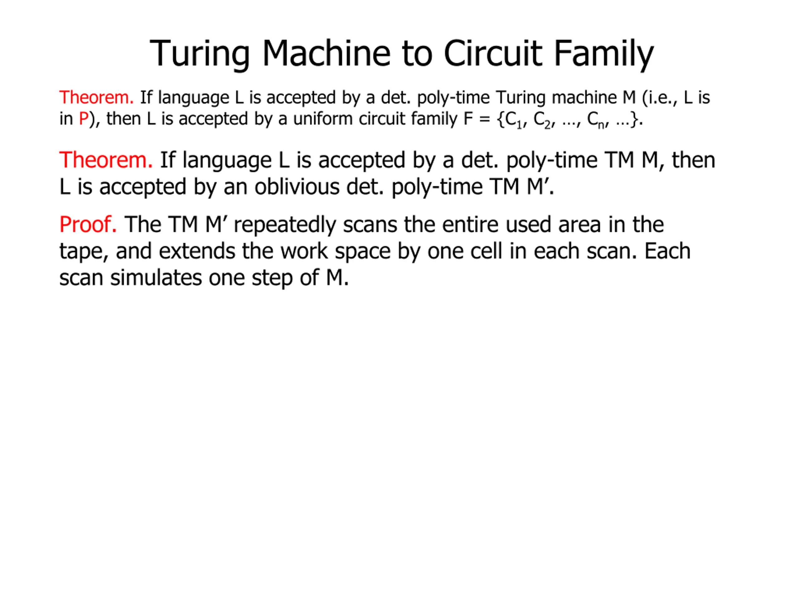 Turing Machine to Circuit Family Theorem. If language L is accepted by a det. poly-time Turing machine M (i.e., L is in P), then L is accepted by a uniform circuit family F = {C1, C2, , Cn, }. Theorem. If language L is accepted by a det. poly-time TM M, then L is accepted by an oblivious det. poly-time TM M . Proof. The TM M repeatedly scans the entire used area in the tape, and extends the work space by one cell in each scan. Each scan simulates one step of M. x M M