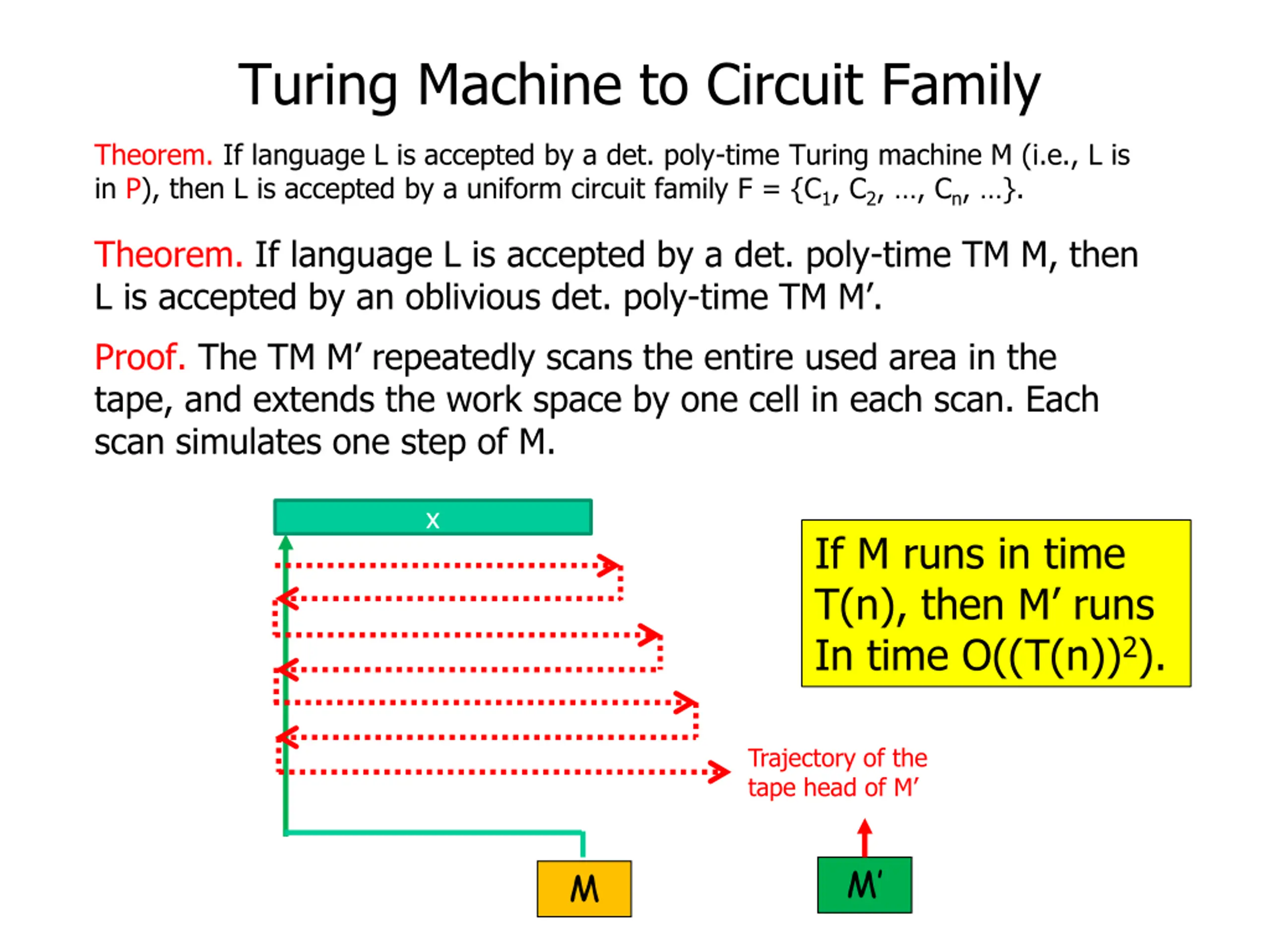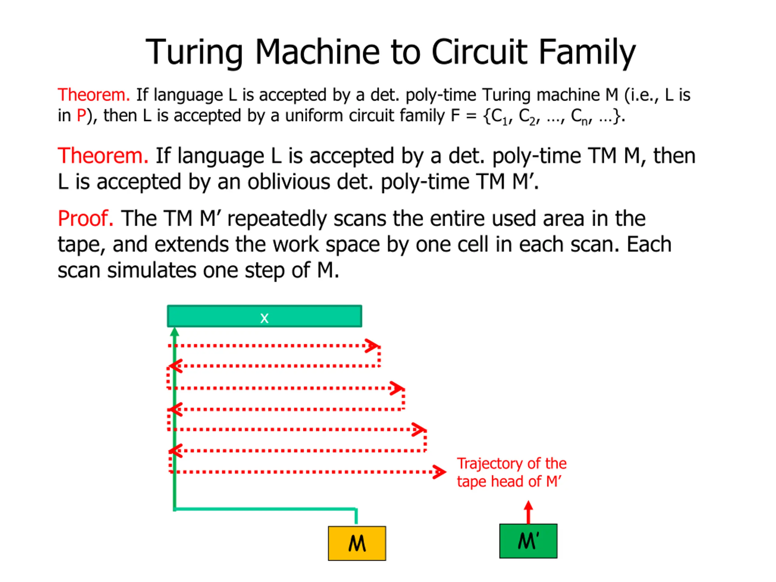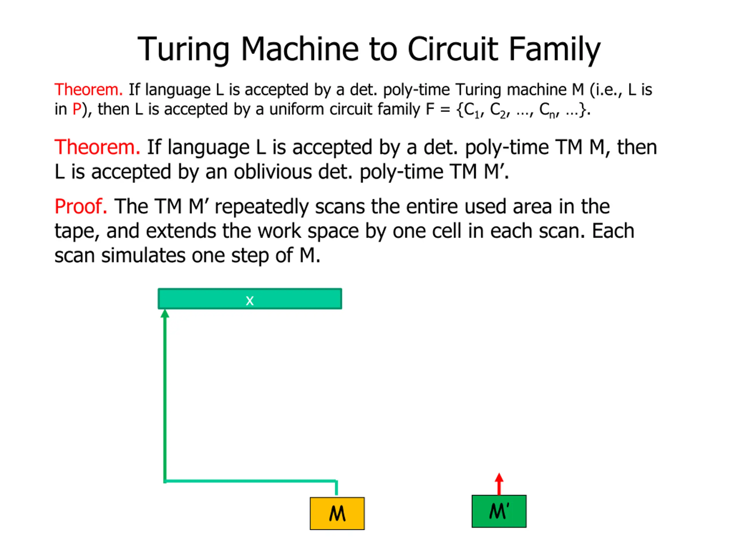 Turing Machine to Circuit Family Theorem. If language L is accepted by a det. poly-time Turing machine M (i.e., L is in P), then L is accepted by a uniform circuit family F = {C1, C2, , Cn, }. Theorem. If language L is accepted by a det. poly-time TM M, then L is accepted by an oblivious det. poly-time TM M . Proof. The TM M repeatedly scans the entire used area in the tape, and extends the work space by one cell in each scan. Each scan simulates one step of M. x M M