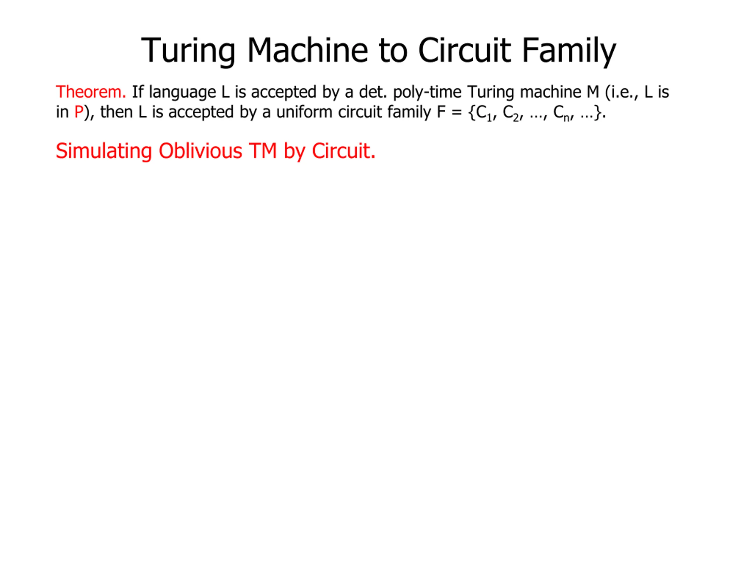 Turing Machine to Circuit Family Theorem. If language L is accepted by a det. poly-time Turing machine M (i.e., L is in P), then L is accepted by a uniform circuit family F = {C1, C2, , Cn, }. Simulating Oblivious TM by Circuit.