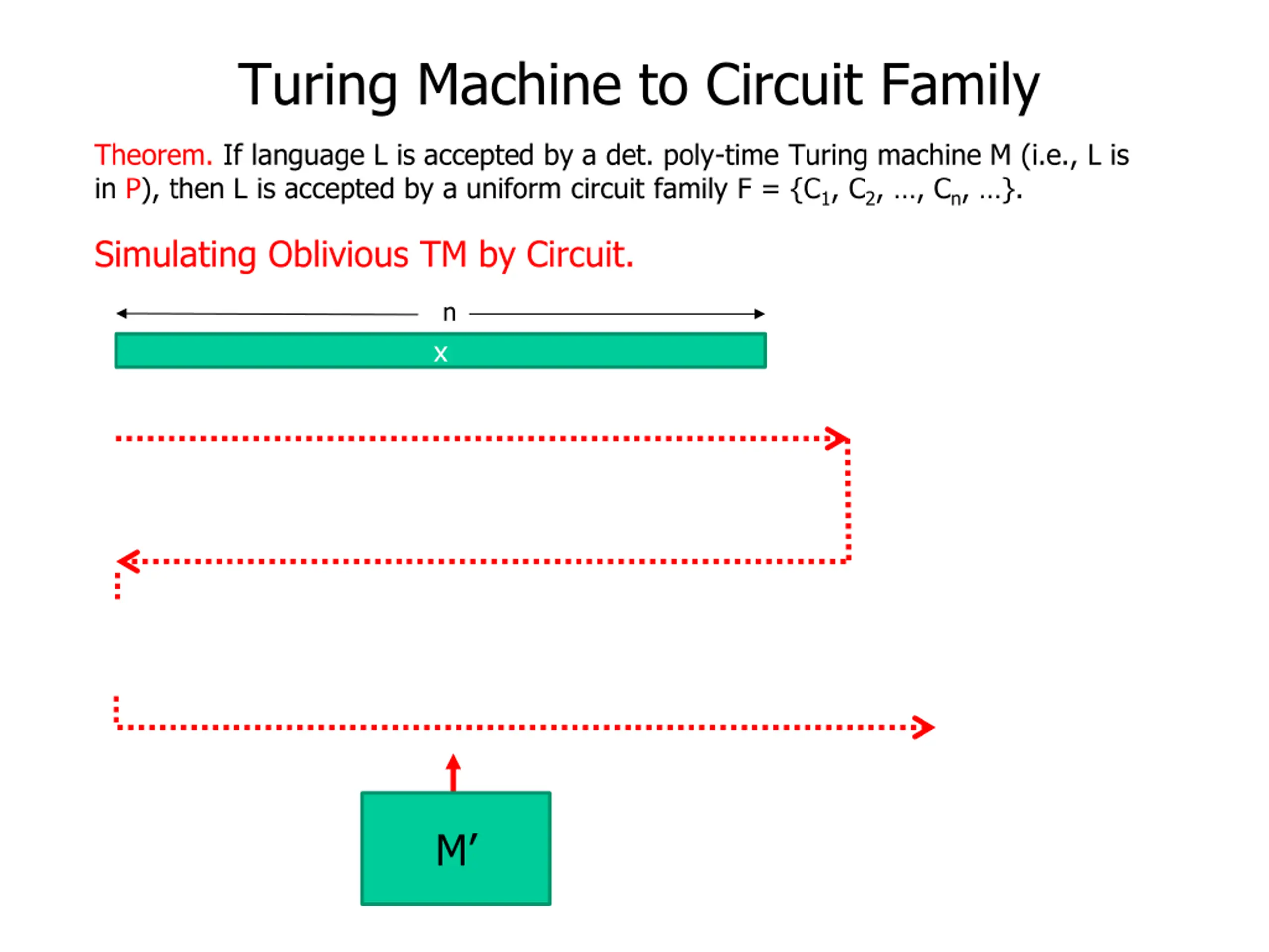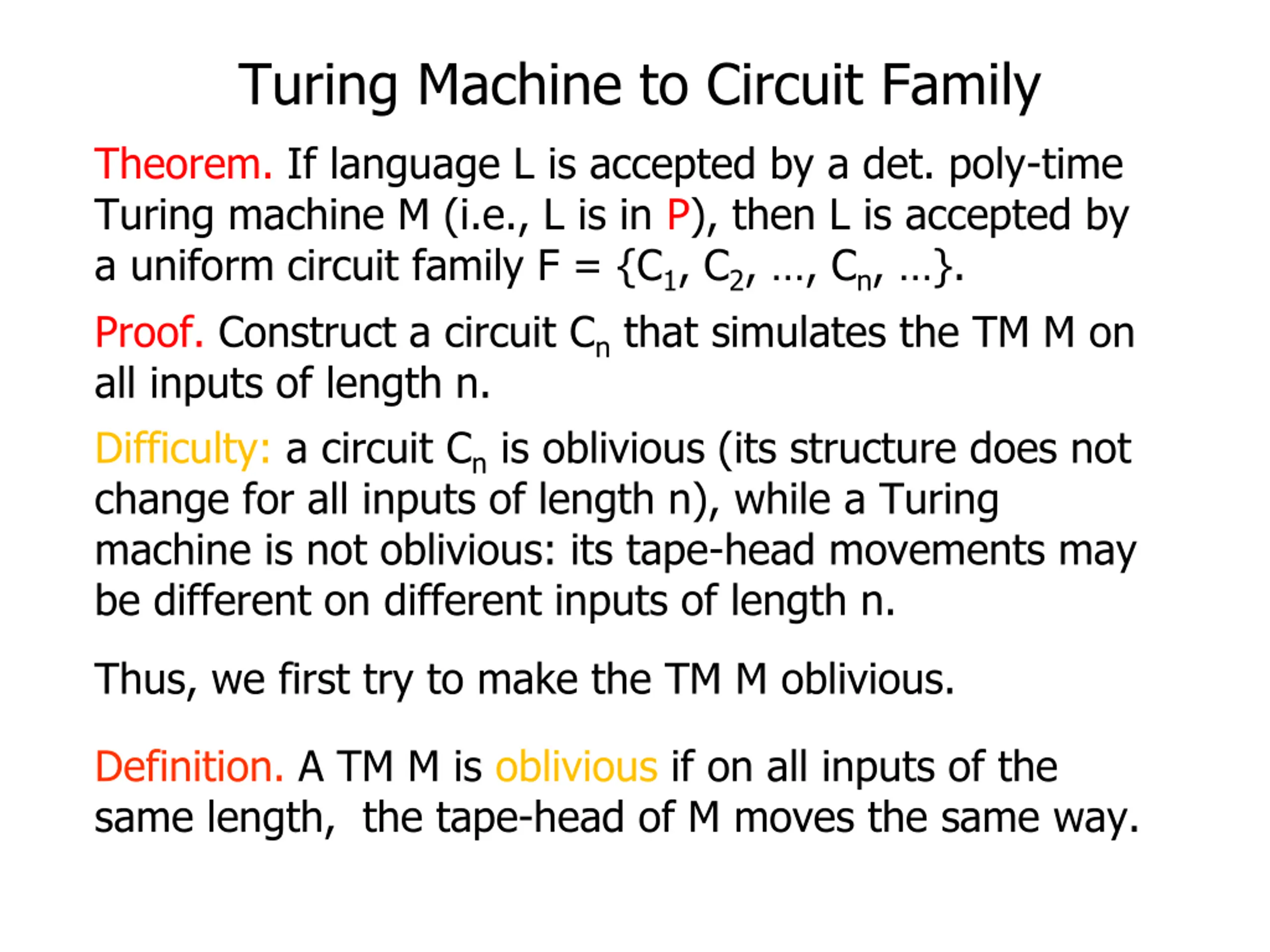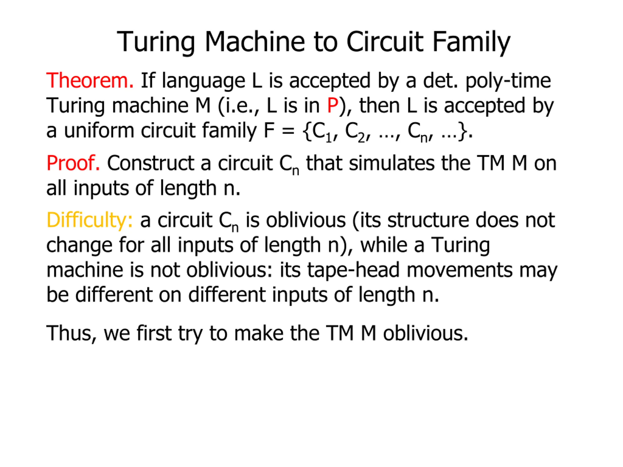 Turing Machine to Circuit Family Theorem. If language L is accepted by a det. poly-time Turing machine M (i.e., L is in P), then L is accepted by a uniform circuit family F = {C1, C2, , Cn, }. Proof. Construct a circuit Cn that simulates the TM M on all inputs of length n. Difficulty: a circuit Cn is oblivious (its structure does not change for all inputs of length n), while a Turing machine is not oblivious: its tape-head movements may be different on different inputs of length n. Thus, we first try to make the TM M oblivious.