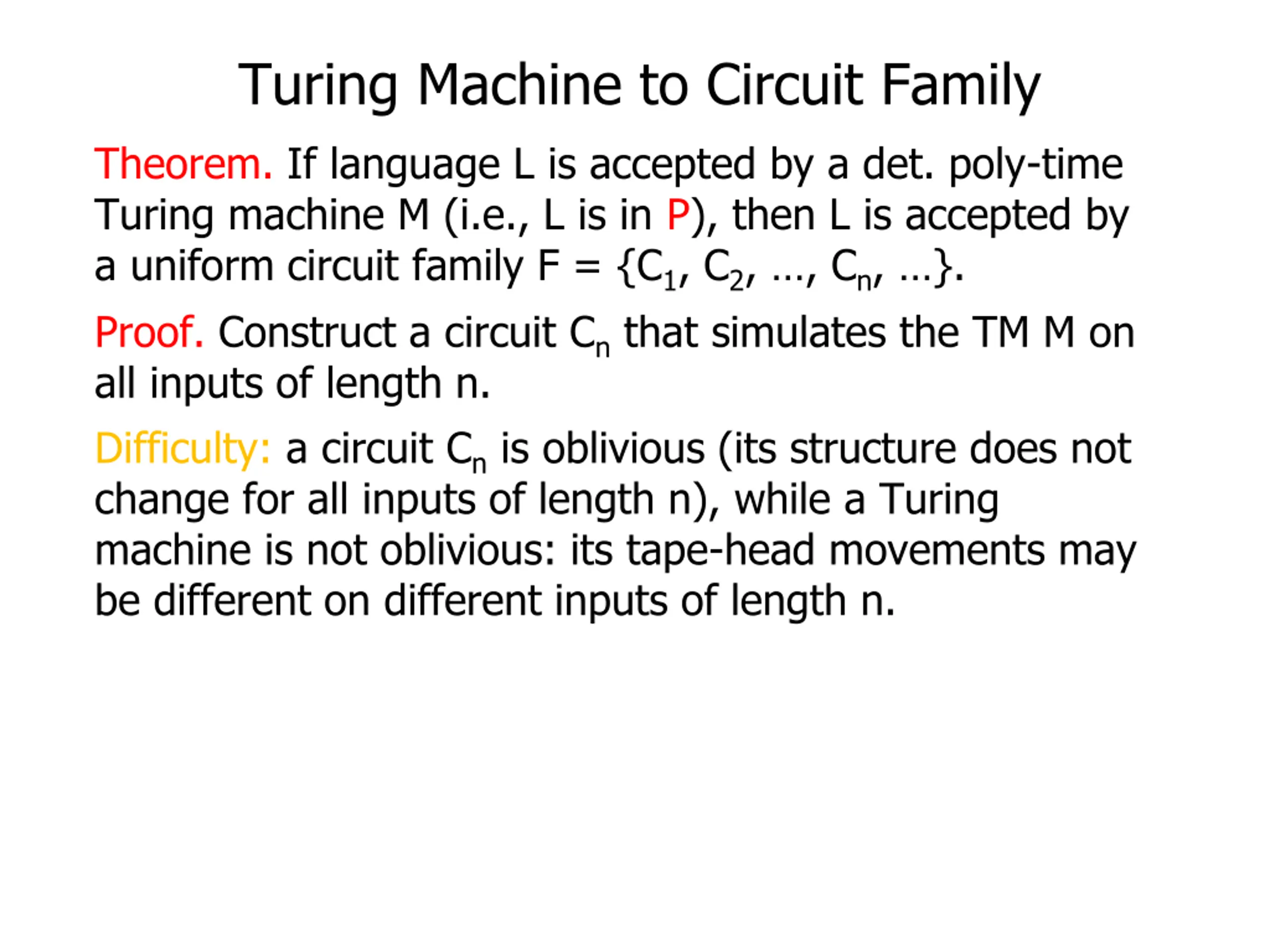 Turing Machine to Circuit Family Theorem. If language L is accepted by a det. poly-time Turing machine M (i.e., L is in P), then L is accepted by a uniform circuit family F = {C1, C2, , Cn, }. Proof. Construct a circuit Cn that simulates the TM M on all inputs of length n. Difficulty: a circuit Cn is oblivious (its structure does not change for all inputs of length n), while a Turing machine is not oblivious: its tape-head movements may be different on different inputs of length n.