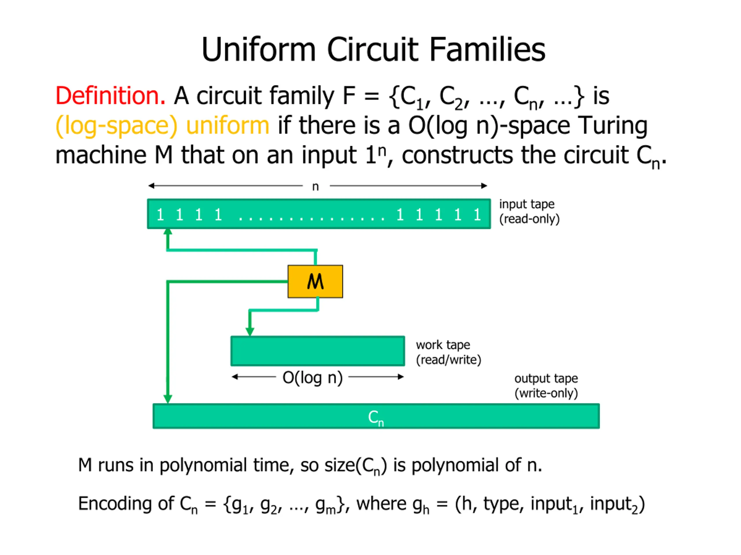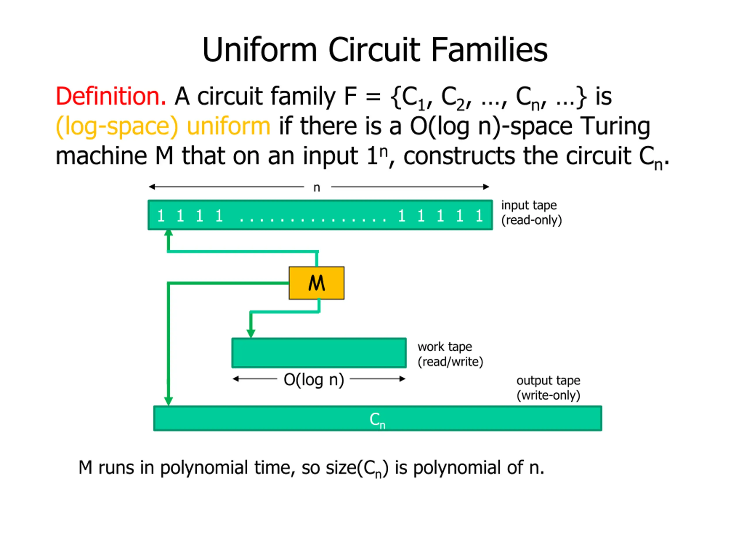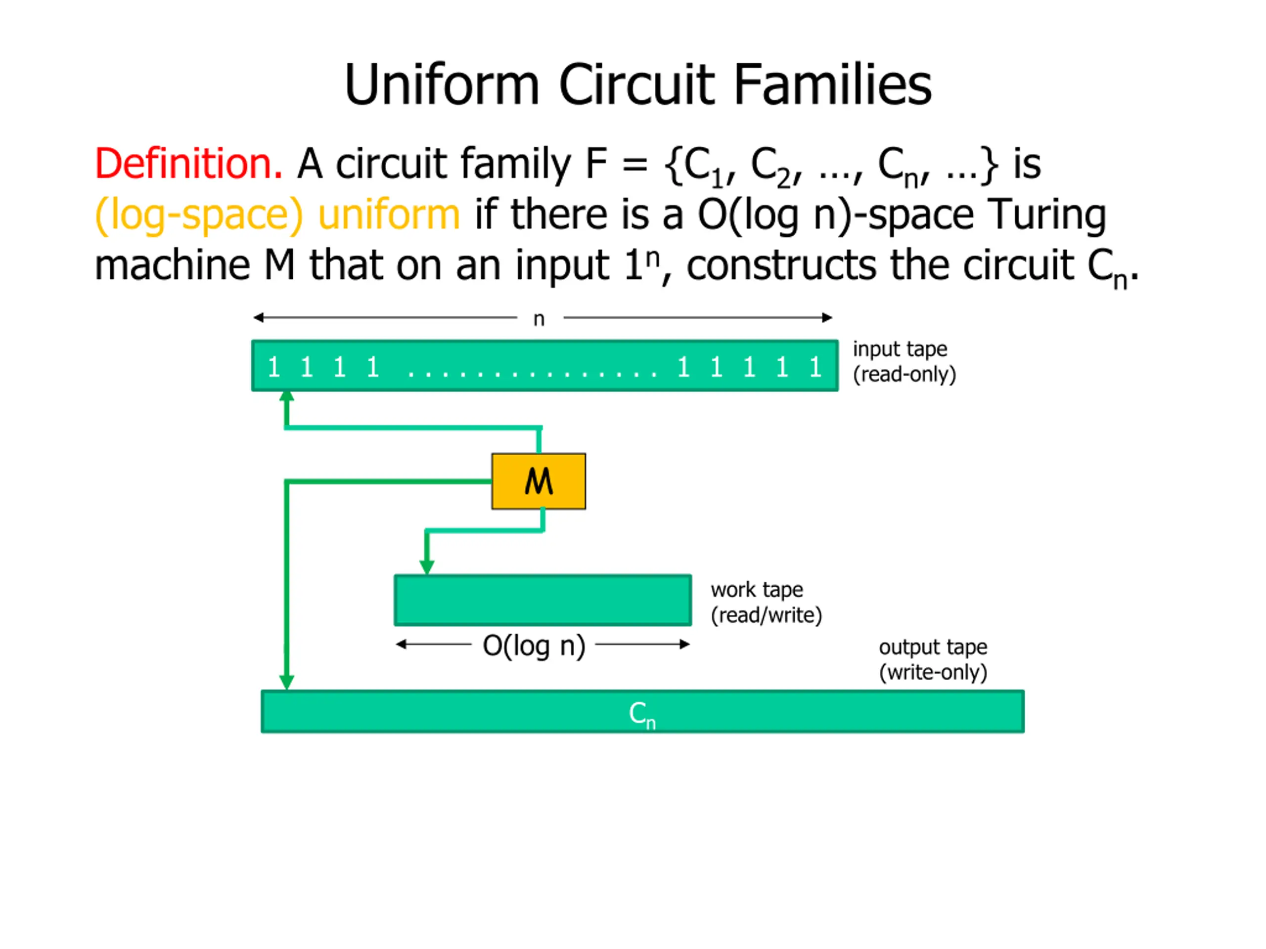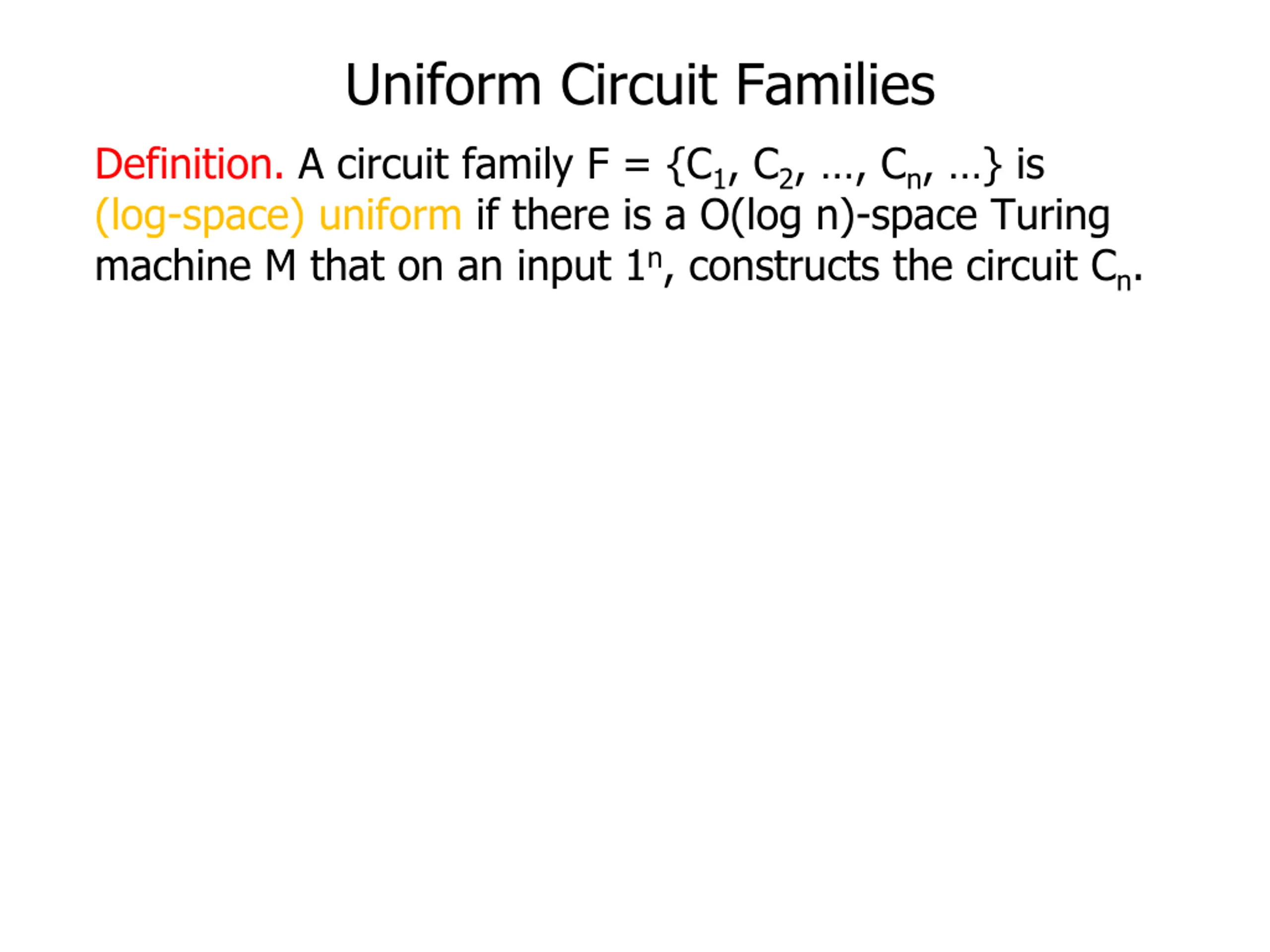 Uniform Circuit Families Definition. A circuit family F = {C1, C2, , Cn, } is (log-space) uniform if there is a O(log n)-space Turing machine M that on an input 1n, constructs the circuit Cn.