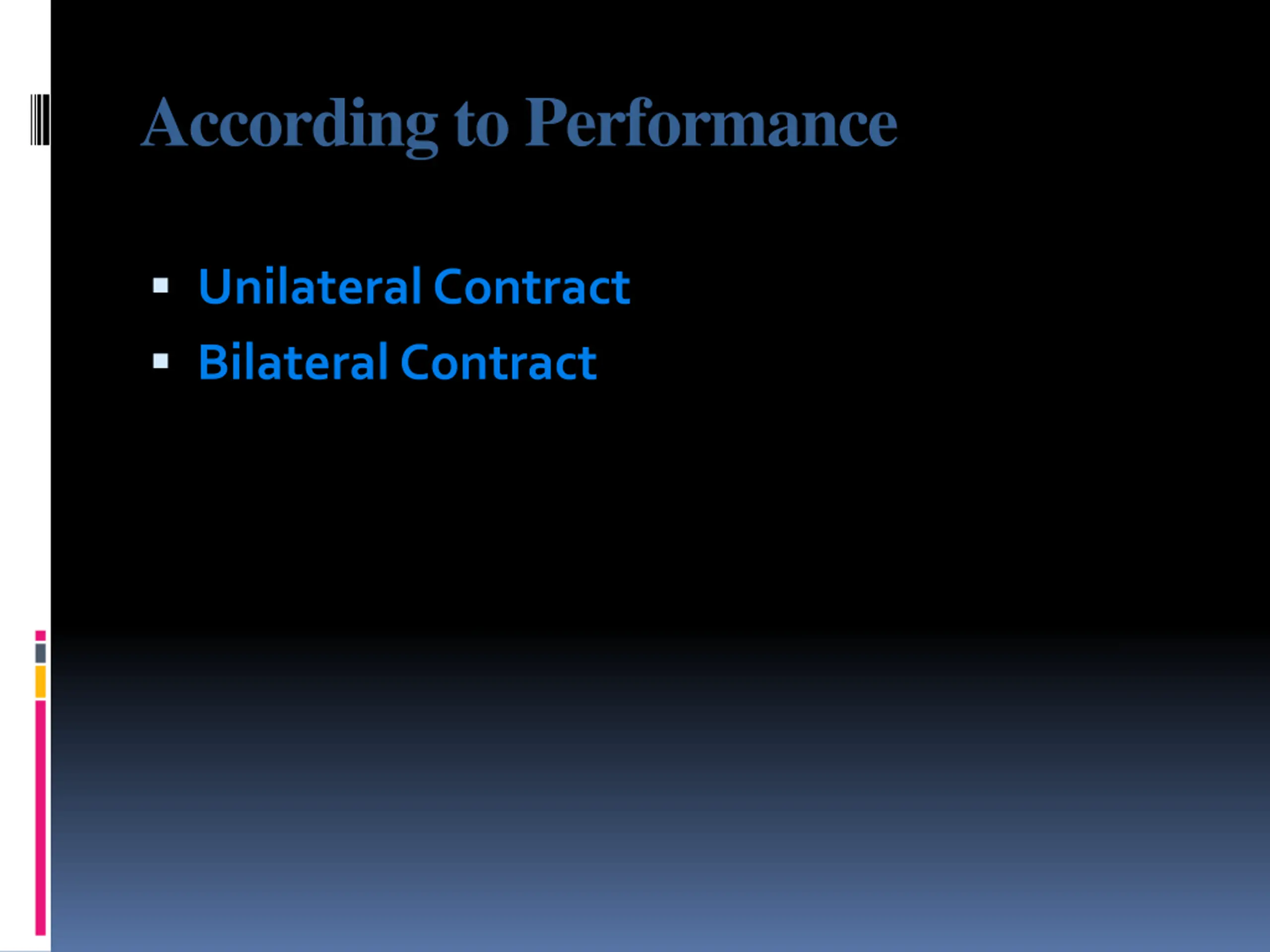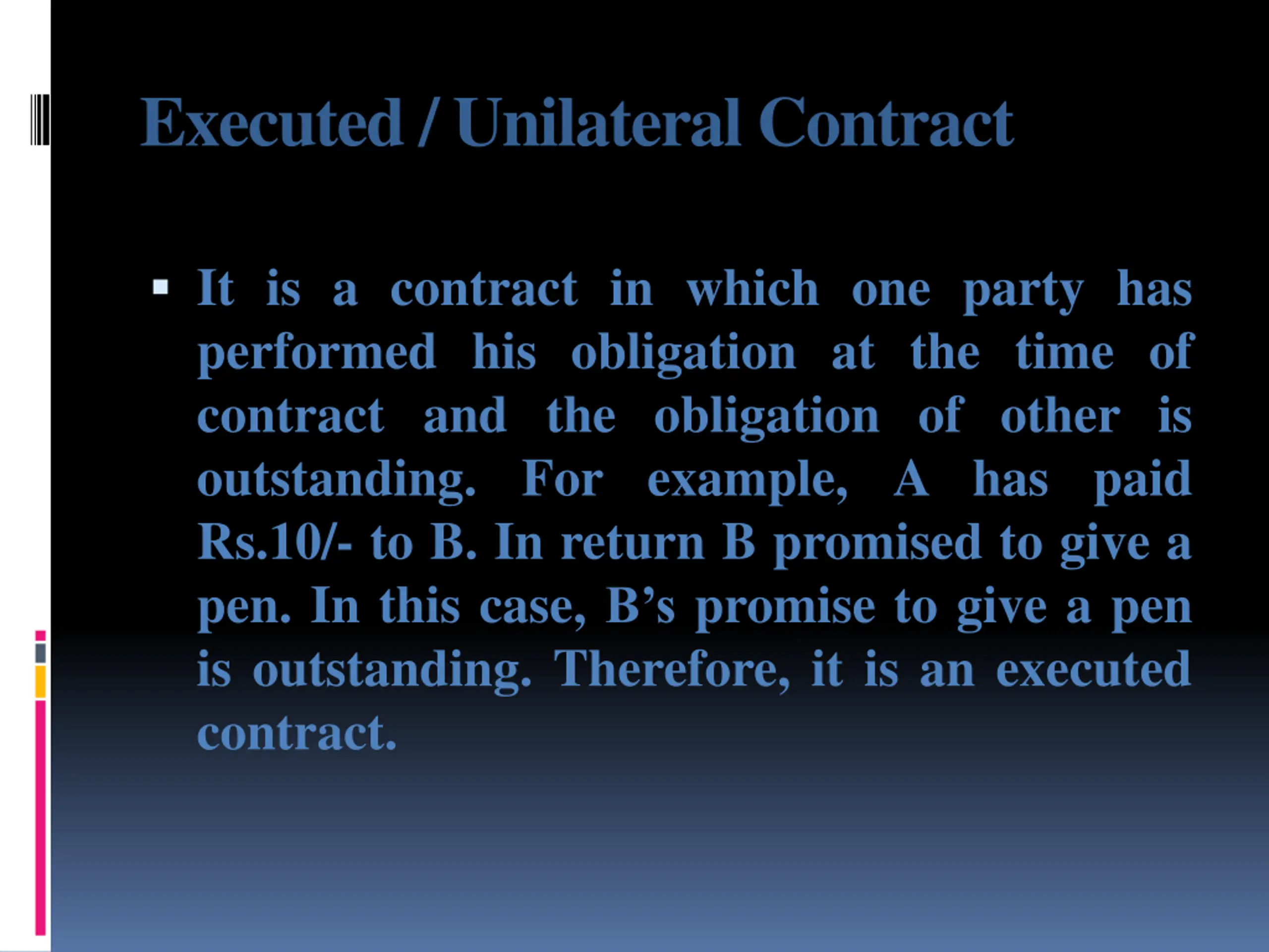 Executed / Unilateral Contract It is a contract in which one party has performed his obligation at the time of contract and the obligation of other is outstanding. For example, A has paid Rs.10/- to B. In return B promised to give a pen. In this case, B s promise to give a pen is outstanding. Therefore, it is an executed contract.