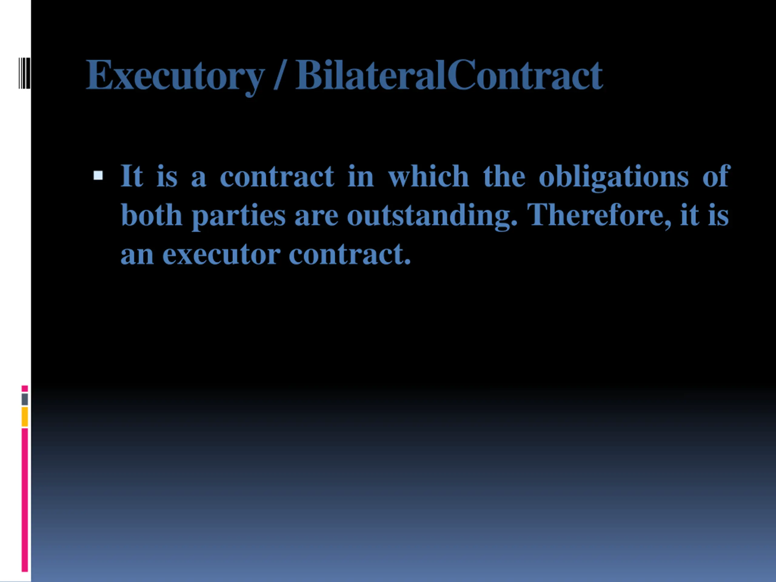 Executory / BilateralContract It is a contract in which the obligations of both parties are outstanding. Therefore, it is an executor contract.