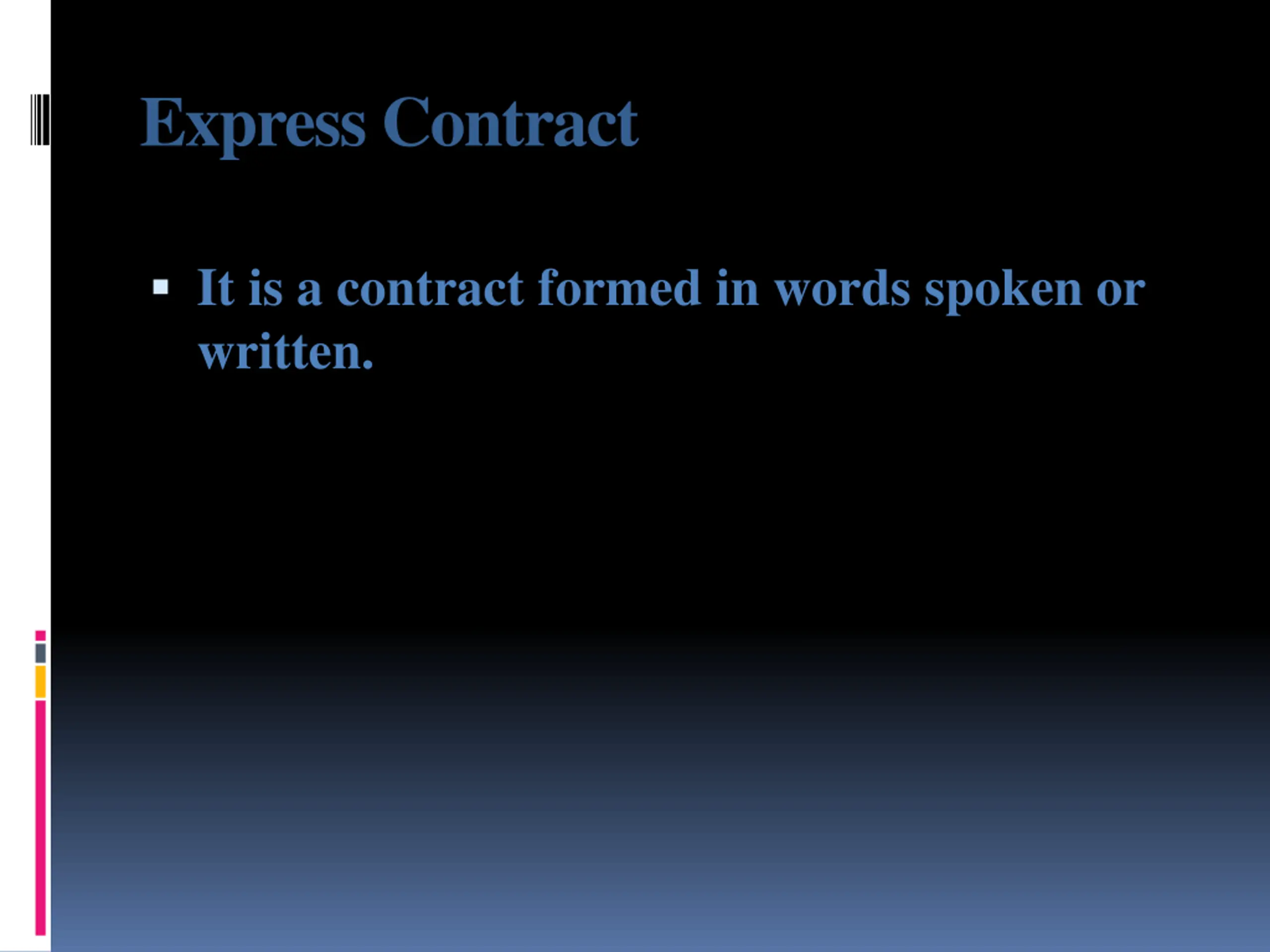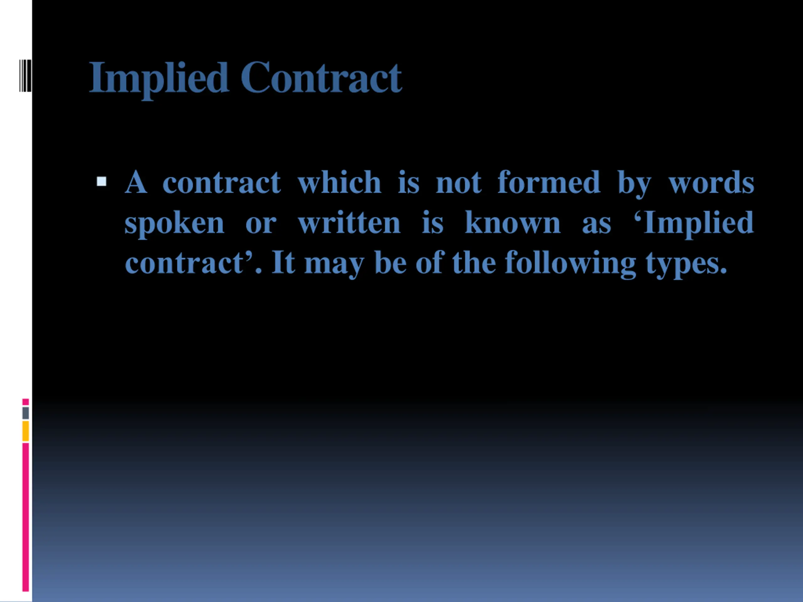 Implied Contract A contract which is not formed by words spoken or written is known as Implied contract . It may be of the following types.