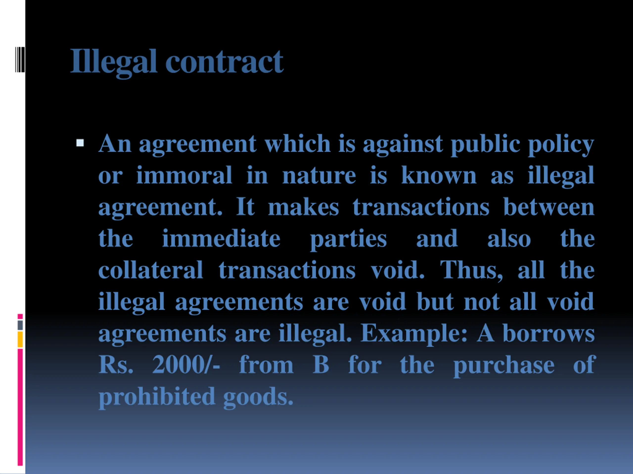 Illegal contract An agreement which is against public policy or immoral in nature is known as illegal agreement. It makes transactions between the immediate parties collateral transactions void. Thus, all the illegal agreements are void but not all void agreements are illegal. Example: A borrows Rs. 2000/- from B for the purchase of prohibited goods. and also the