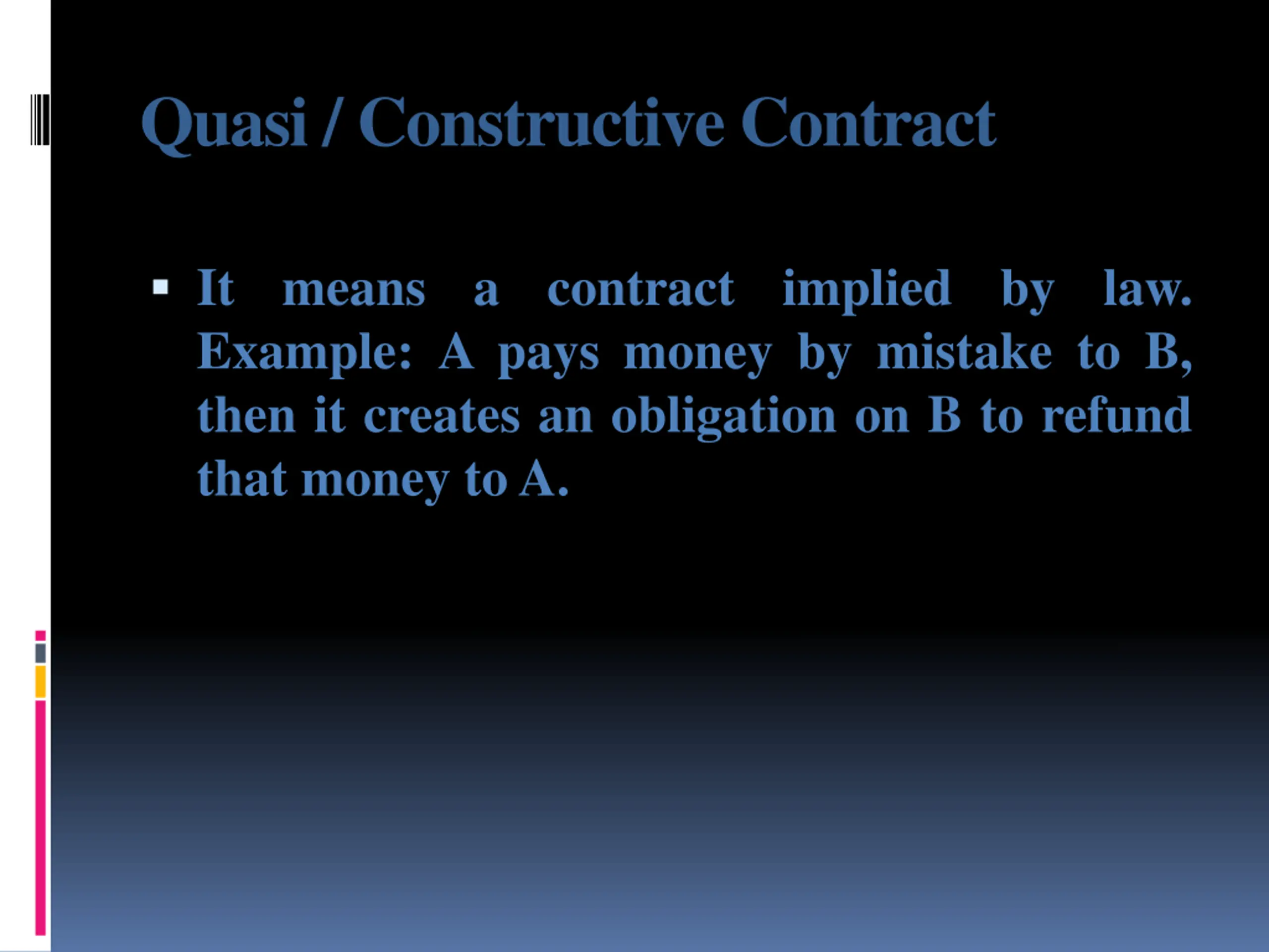 Quasi / Constructive Contract It means a contract implied by law. Example: A pays money by mistake to B, then it creates an obligation on B to refund that money toA.