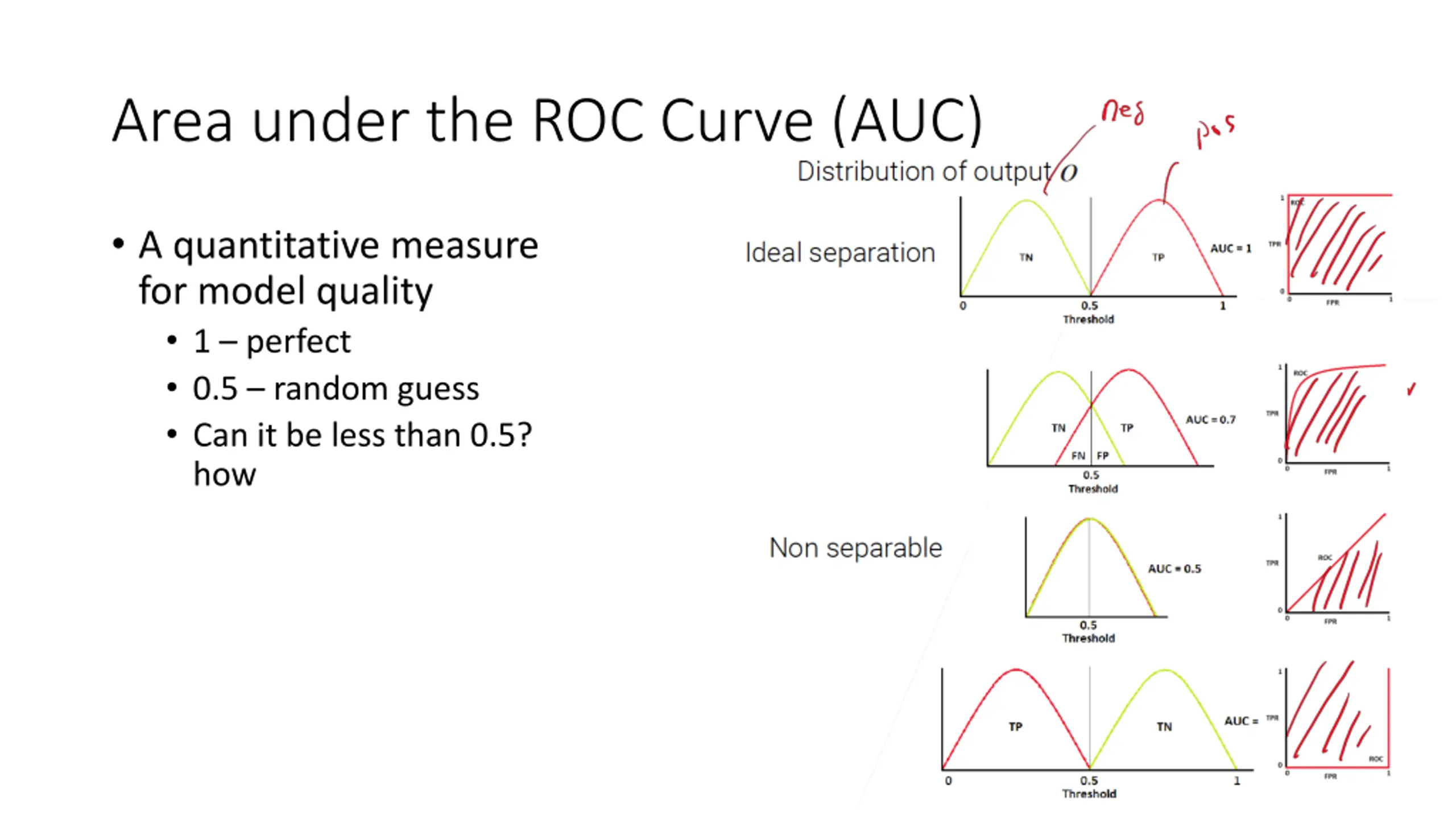 Area under the ROC Curve (AUC) A quantitative measure for model quality 1 perfect 0.5 random guess Can it be less than 0.5? how