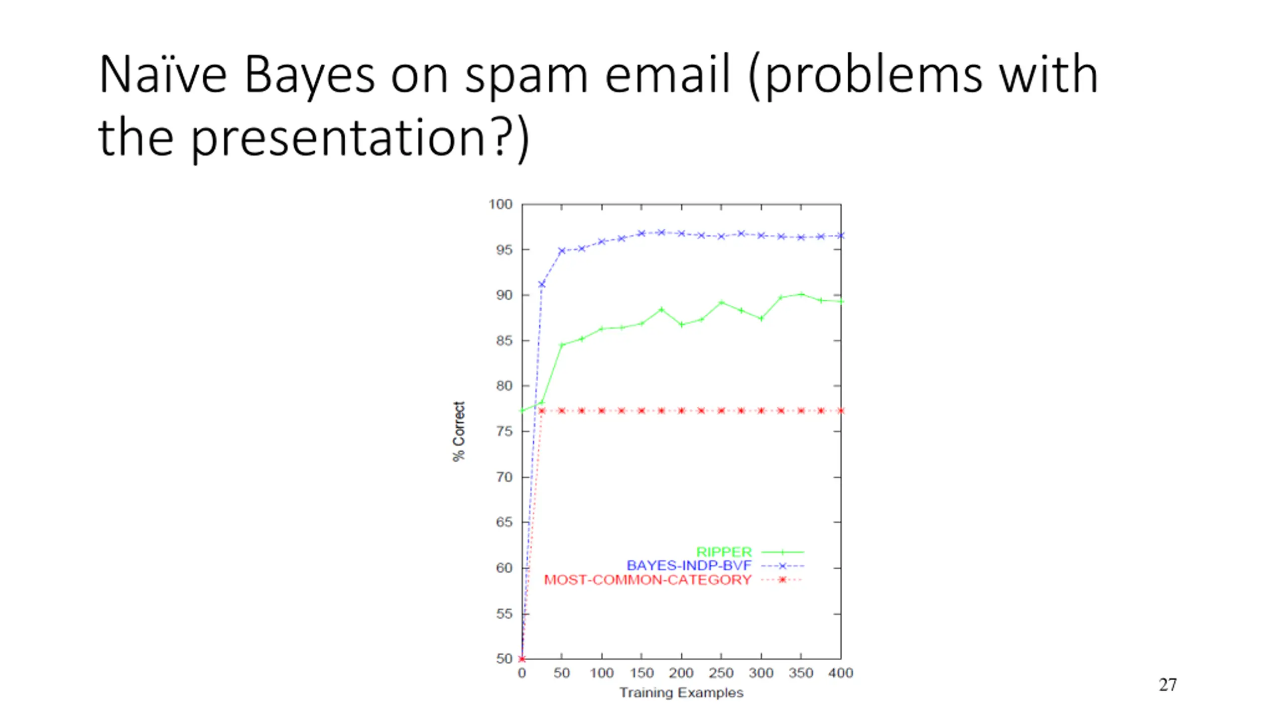 Example: SpamAssassin Na ve Bayes has found a home in spam filtering Paul Graham s A Plan for Spam A mutant with more mutant offspring... Naive Bayes-like classifier with weird parameter estimation Widely used in spam filters Classic Naive Bayes superior when appropriately used According to David D. Lewis But also many other things: black hole lists, etc. Many email topic filters also use NB classifiers 26