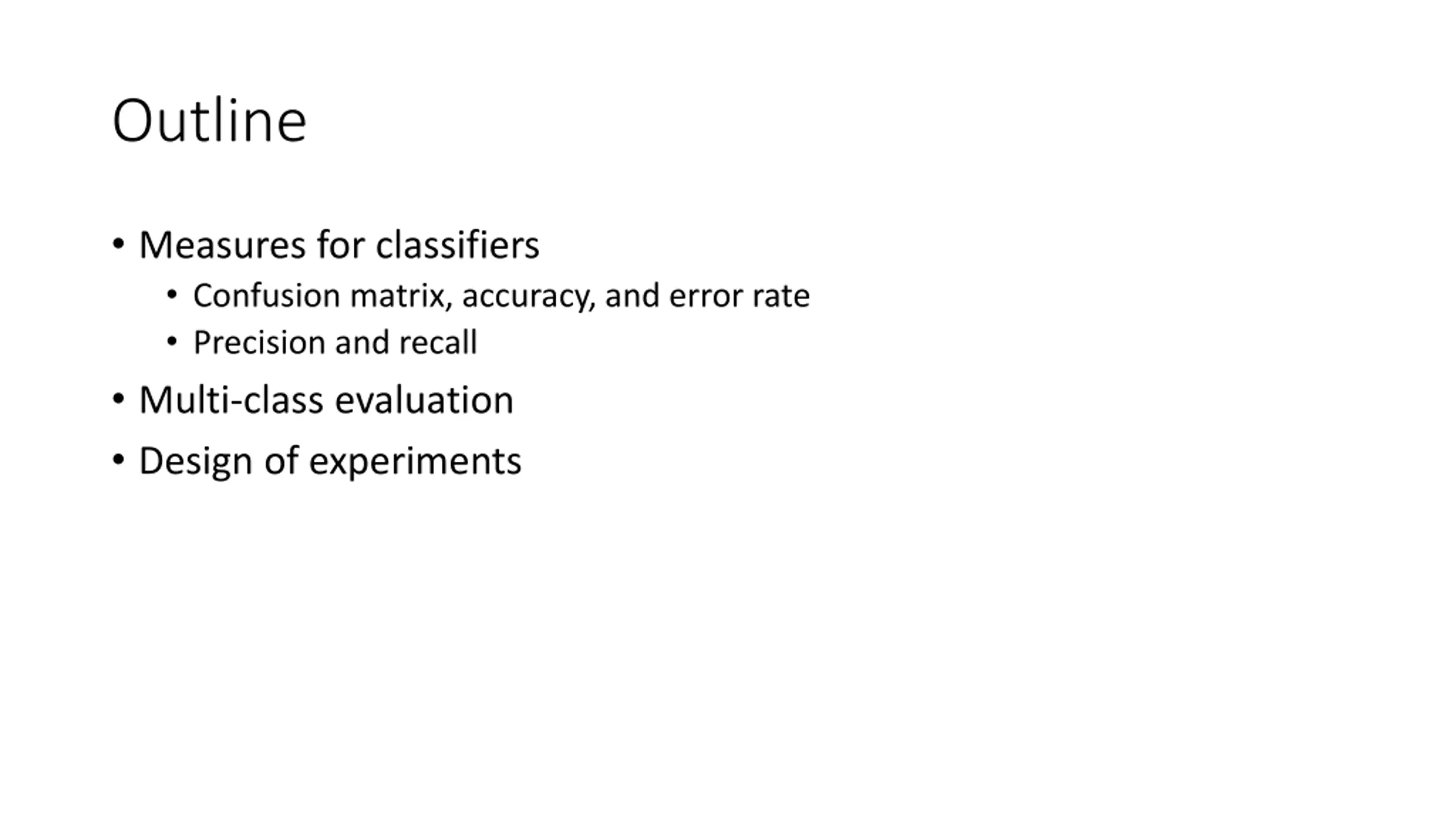 Outline Measures for classifiers Confusion matrix, accuracy, and error rate Precision and recall Multi-class evaluation Design of experiments