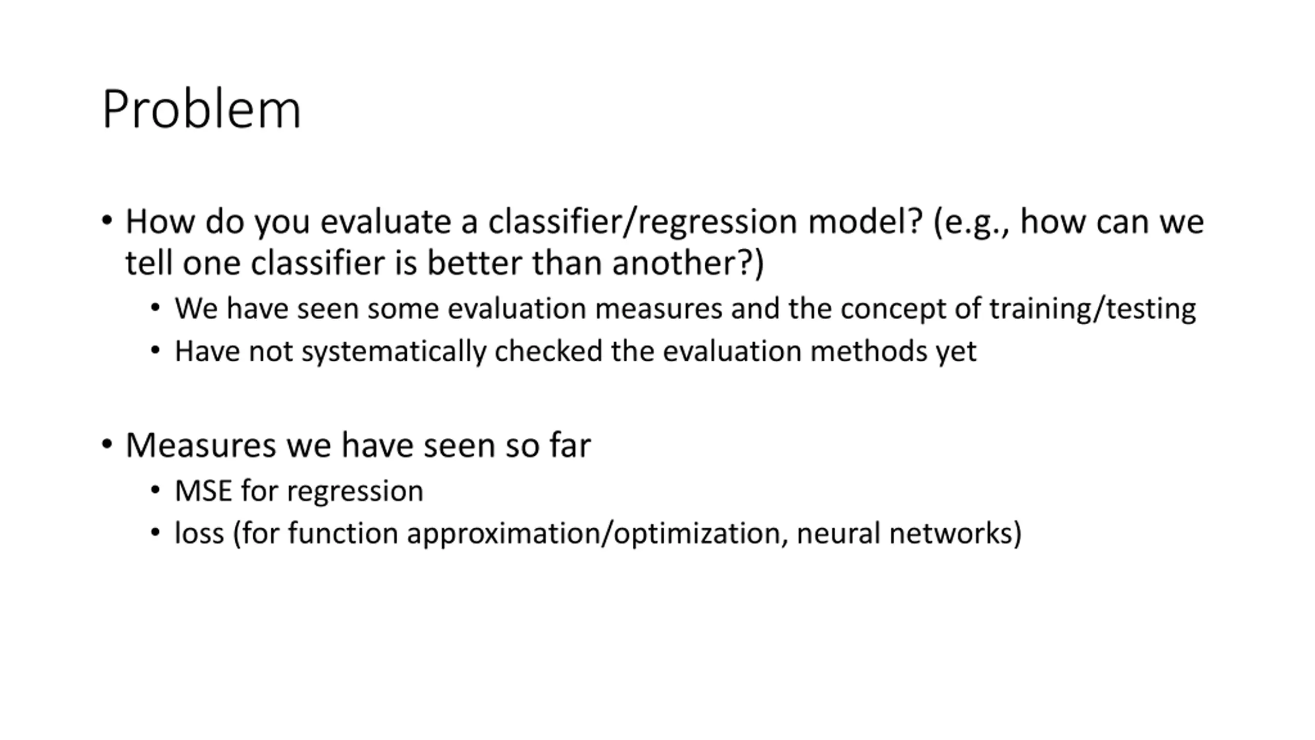 Problem How do you evaluate a classifier/regression model? (e.g., how can we tell one classifier is better than another?) We have seen some evaluation measures and the concept of training/testing Have not systematically checked the evaluation methods yet Measures we have seen so far MSE for regression loss (for function approximation/optimization, neural networks)