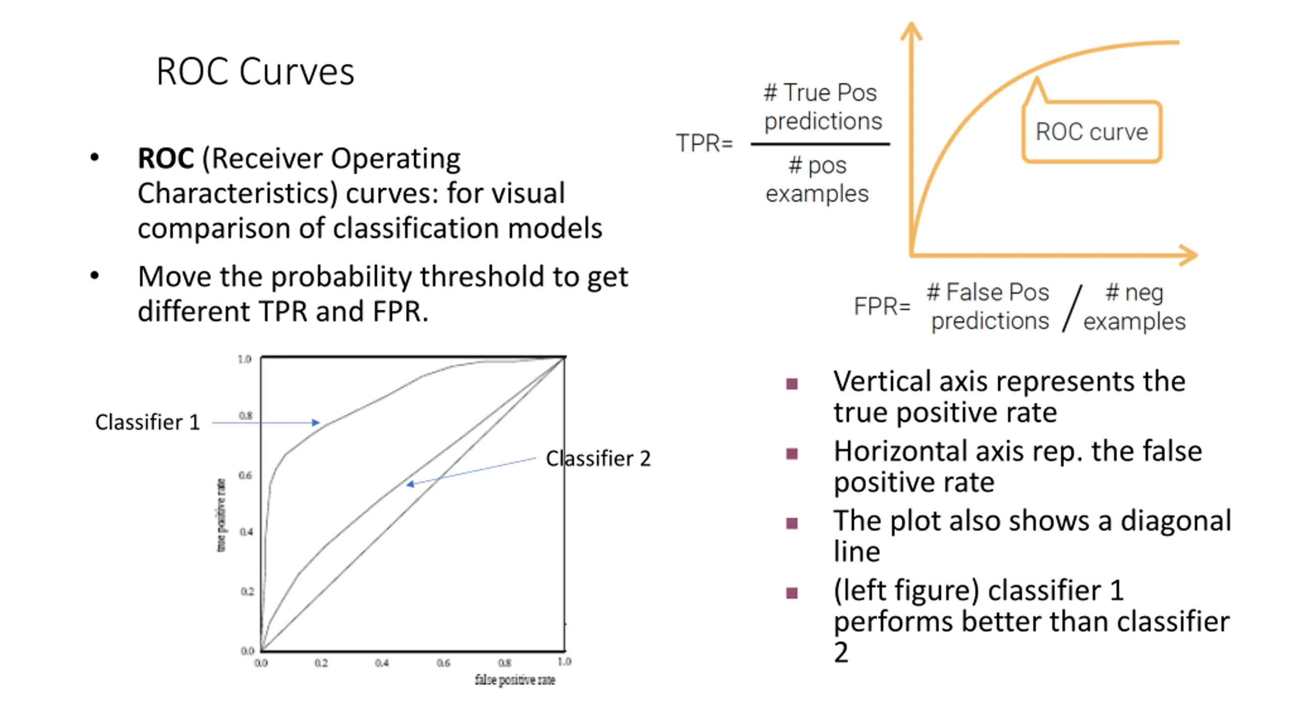 ROC Curves ROC (Receiver Operating Characteristics) curves: for visual comparison of classification models Move the probability threshold to get different TPR and FPR. Vertical axis represents the true positive rate Horizontal axis rep. the false positive rate The plot also shows a diagonal line (left figure) classifier 1 performs better than classifier 2 Classifier 1 Classifier 2