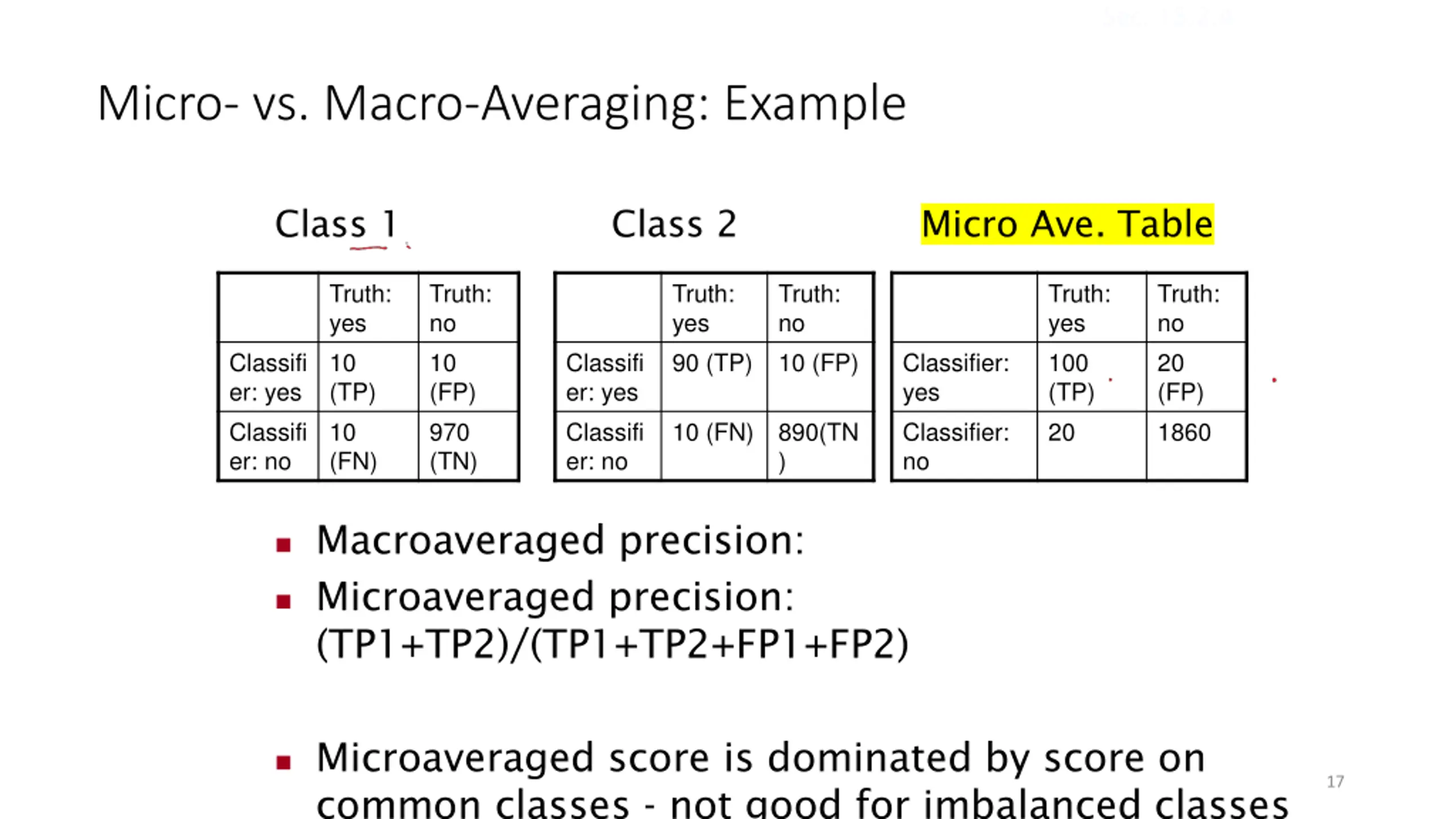 Micro- vs. Macro-Averaging If we have more than one class, how do we combine multiple performance measures into one quantity? Macroaveraging: Compute performance for each class, then average. Microaveraging: Collect decisions for all classes, compute contingency table, evaluate.