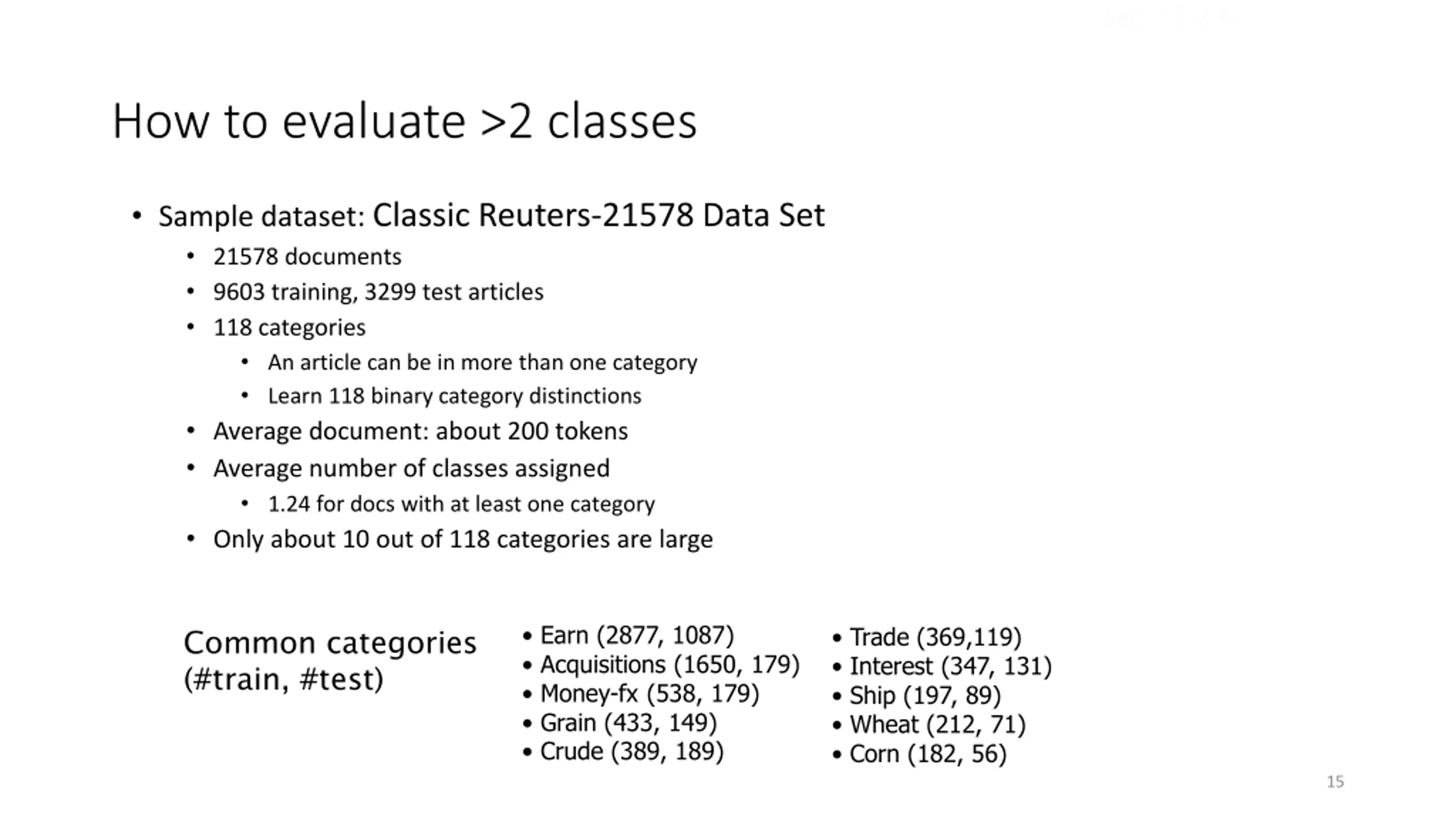Sec. 15.2.4 How to evaluate >2 classes Sample dataset: Classic Reuters-21578 Data Set 21578 documents 9603 training, 3299 test articles 118 categories An article can be in more than one category Learn 118 binary category distinctions Average document: about 200 tokens Average number of classes assigned 1.24 for docs with at least one category Only about 10 out of 118 categories are large Earn (2877, 1087) Acquisitions (1650, 179) Money-fx (538, 179) Grain (433, 149) Crude (389, 189) Trade (369,119) Interest (347, 131) Ship (197, 89) Wheat (212, 71) Corn (182, 56) Common categories (#train, #test) 15