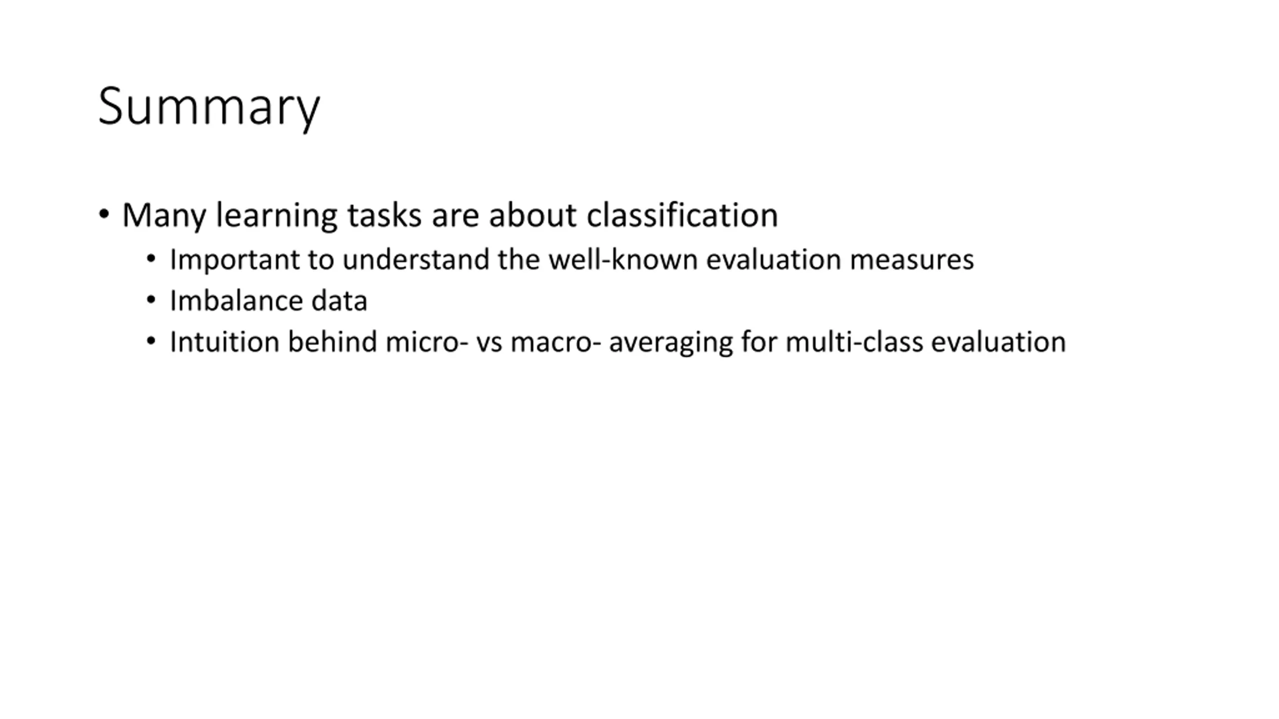 Summary Many learning tasks are about classification Important to understand the well-known evaluation measures Imbalance data Intuition behind micro- vs macro- averaging for multi-class evaluation