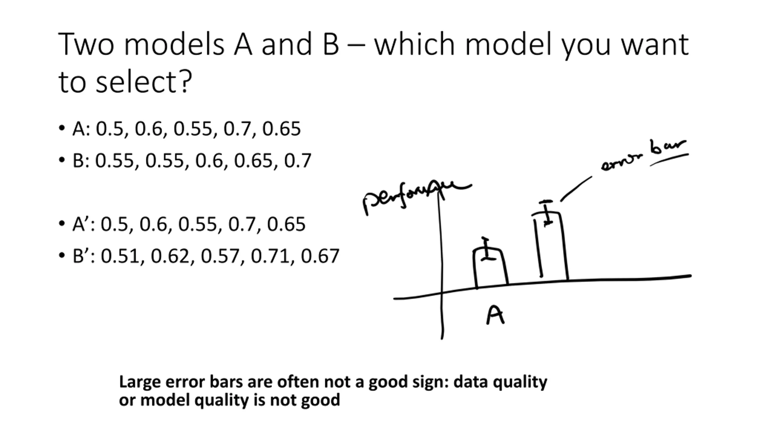 Two models A and B which model you want to select? A: 0.5, 0.6, 0.55, 0.7, 0.65 B: 0.55, 0.55, 0.6, 0.65, 0.7 A : 0.5, 0.6, 0.55, 0.7, 0.65 B : 0.51, 0.62, 0.57, 0.71, 0.67 Large error bars are often not a good sign: data quality or model quality is not good