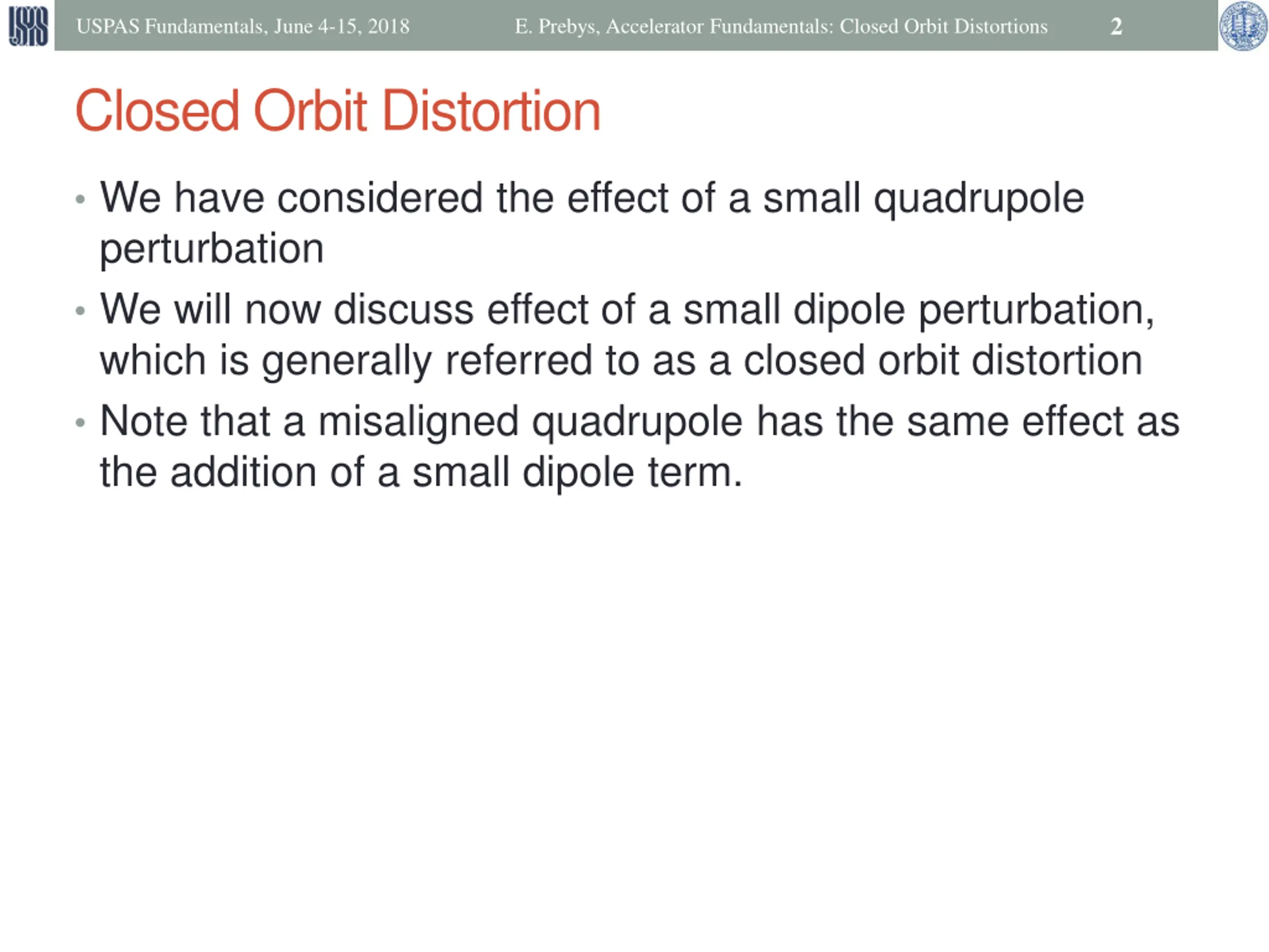 2 USPAS Fundamentals, June 4-15, 2018 E. Prebys, Accelerator Fundamentals: Closed Orbit Distortions Closed Orbit Distortion We have considered the effect of a small quadrupole perturbation We will now discuss effect of a small dipole perturbation, which is generally referred to as a closed orbit distortion Note that a misaligned quadrupole has the same effect as the addition of a small dipole term.