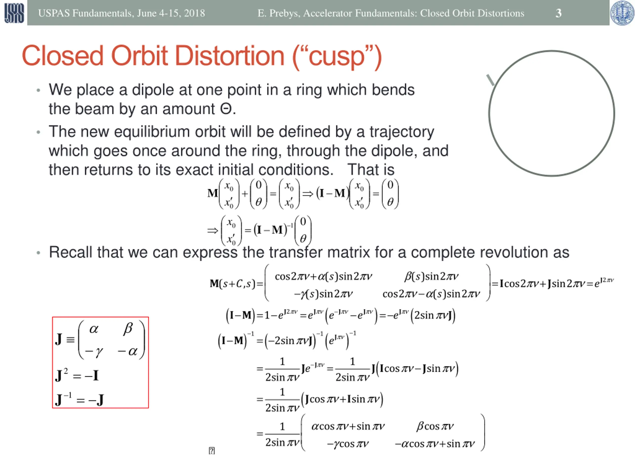 3 USPAS Fundamentals, June 4-15, 2018 E. Prebys, Accelerator Fundamentals: Closed Orbit Distortions Closed Orbit Distortion ( cusp ) We place a dipole at one point in a ring which bends the beam by an amount . The new equilibrium orbit will be defined by a trajectory which goes once around the ring, through the dipole, and then returns to its exact initial conditions. That is 0 x 0 0 x x x ( ) 0 0 0 + = = M I M 0 0 x x x 0 ( ) 1 0 = I M 0 x Recall that we can express the transfer matrix for a complete revolution as ( ( 1 2sinpnJe-Jpn= 1 2sinpn 1 2sinpn =Icos2pn+Jsin2pn =eJ2pn cos2pn+a(s)sin2pn -g(s)sin2pn )=1-eJ2pn=eJpne-Jpn-eJpn -1= -2sinpnJ ( b(s)sin2pn cos2pn -a(s)sin2pn )=-eJpn2sinpnJ M(s+C,s)= ( ( ( ) I-M ) ) ) -1 -1eJpn J I-M 1 ( ) = 2sinpnJ Icospn-Jsinpn ) = 2 J I ( 1 = J J = Jcospn+Isinpn acospn+sinpn -gcospn bcospn -acospn+sinpn = ? ? ?