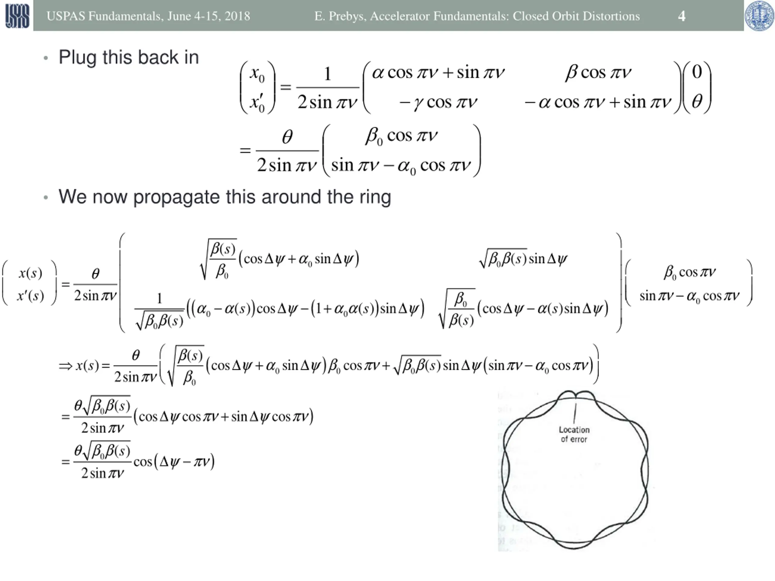 4 USPAS Fundamentals, June 4-15, 2018 E. Prebys, Accelerator Fundamentals: Closed Orbit Distortions Plug this back in cos + cos cos sin cos 0 x 1 0 = 0 + sin x 2 sin cos 0 cos 0 = sin 2 sin We now propagate this around the ring b(s) b0 ( ) cosDy +a0sinDy b0b(s)sinDy = b0cospn sinpn -a0cospn q x(s) x (s) 2sinpn b0 b(s) 1 ( ) ( )cosDy - 1+a0a(s) ( )sinDy ( ) a0-a(s) cosDy -a(s)sinDy b0b(s) q b(s) b0 ( )b0cospn + b0b(s)sinDy sinpn -a0cospn ( ) x(s)= cosDy +a0sinDy 2sinpn =q b0b(s) 2sinpn =q b0b(s) 2sinpn ( ) cosDy cospn +sinDy cospn cos Dy -pn ( )