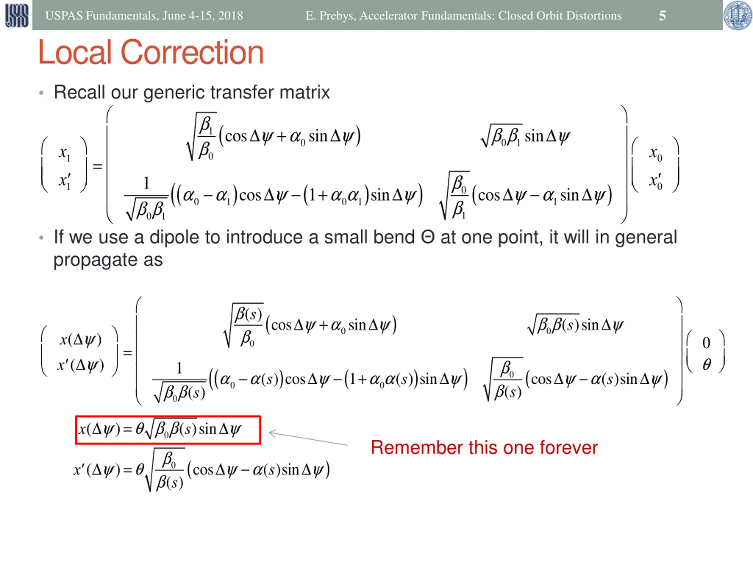 5 USPAS Fundamentals, June 4-15, 2018 E. Prebys, Accelerator Fundamentals: Closed Orbit Distortions Local Correction Recall our generic transfer matrix b1 b0 ( ) cosDy +a0sinDy b0b1sinDy = x1 x1 x0 x0 b0 b1 1 ( ) ( )cosDy - 1+a0a1 ( )sinDy ( ) a0-a1 cosDy -a1sinDy b0b1 If we use a dipole to introduce a small bend at one point, it will in general propagate as b(s) b0 ( ) cosDy +a0sinDy b0b(s)sinDy = x(Dy) x (Dy) 0 q b0 b(s) 1 ( ) ( )cosDy - 1+a0a(s) ( )sinDy ( ) a0-a(s) cosDy -a(s)sinDy b0b(s) x(Dy)=q b0b(s)sinDy b0 b(s) Remember this one forever ( ) x (Dy)=q cosDy -a(s)sinDy