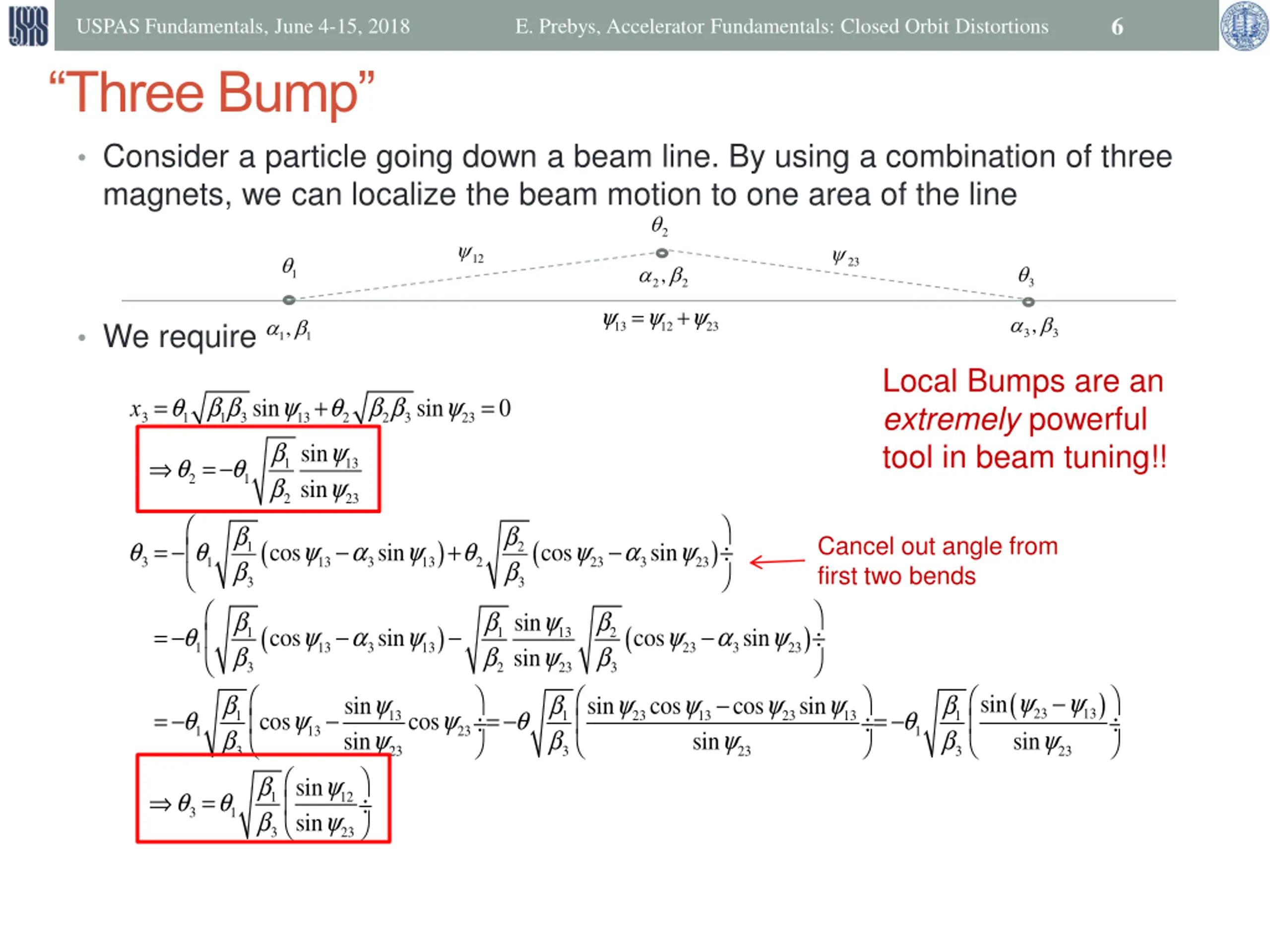 6 USPAS Fundamentals, June 4-15, 2018 E. Prebys, Accelerator Fundamentals: Closed Orbit Distortions Three Bump Consider a particle going down a beam line. By using a combination of three magnets, we can localize the beam motion to one area of the line 2 12 1 23 2, 3 2 y13=y12+y23 3, 1, We require 3 1 Local Bumps are an extremely powerful tool in beam tuning!! x3=q1b1b3siny13+q2b2b3siny23=0 b1 b2 siny23 siny13 q2=-q1 b1 b3 b2 b3 ( )+q2 ( ) Cancel out angle from first two bends q3=- q1 cosy13-a3siny13 cosy23-a3siny23 b1 b3 b1 b2 siny13 siny23 b2 b3 ( )- ( ) =-q1 cosy13-a3siny13 cosy23-a3siny23 sin y23-y13 ( siny23 ) b1 b3 cosy13-siny13 b1 b3 siny23cosy13-cosy23siny13 siny23 b1 b3 =-q1 cosy23 =-q =-q1 siny23 b1 b3 siny12 siny23 q3=q1