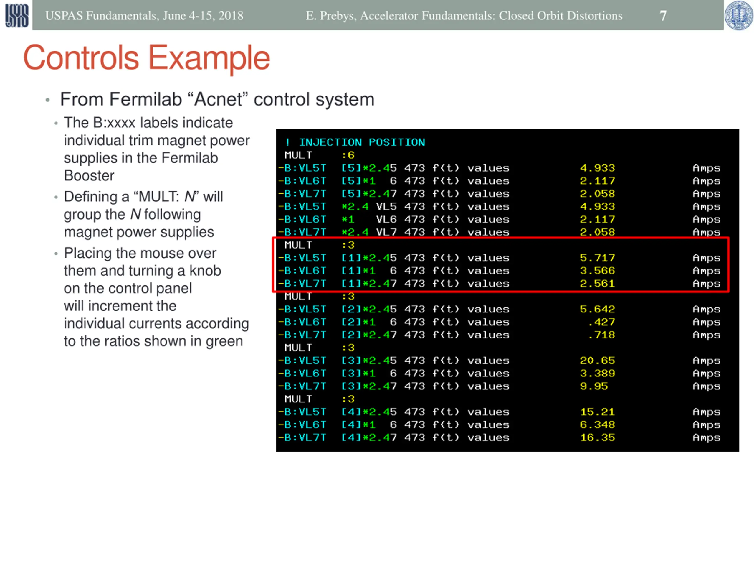 7 USPAS Fundamentals, June 4-15, 2018 E. Prebys, Accelerator Fundamentals: Closed Orbit Distortions Controls Example From Fermilab Acnet control system The B:xxxx labels indicate individual trim magnet power supplies in the Fermilab Booster Defining a MULT: N will group the N following magnet power supplies Placing the mouse over them and turning a knob on the control panel will increment the individual currents according to the ratios shown in green
