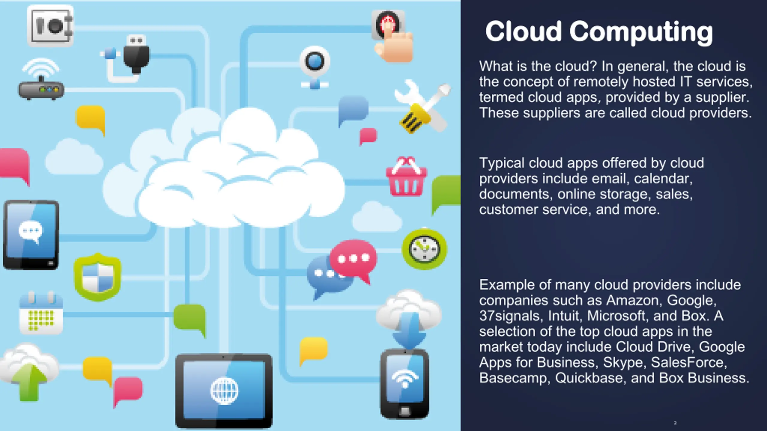 Cloud Cloud Computing Computing What is the cloud? In general, the cloud is the concept of remotely hosted IT services, termed cloud apps, provided by a supplier. These suppliers are called cloud providers. Typical cloud apps offered by cloud providers include email, calendar, documents, online storage, sales, customer service, and more. Example of many cloud providers include companies such as Amazon, Google, 37signals, Intuit, Microsoft, and Box. A selection of the top cloud apps in the market today include Cloud Drive, Google Apps for Business, Skype, SalesForce, Basecamp, Quickbase, and Box Business. 2
