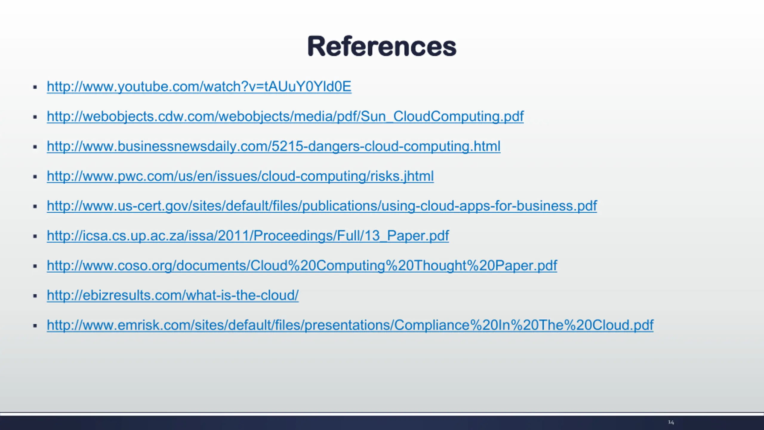 References References http://www.youtube.com/watch?v=tAUuY0Yld0E http://webobjects.cdw.com/webobjects/media/pdf/Sun_CloudComputing.pdf http://www.businessnewsdaily.com/5215-dangers-cloud-computing.html http://www.pwc.com/us/en/issues/cloud-computing/risks.jhtml http://www.us-cert.gov/sites/default/files/publications/using-cloud-apps-for-business.pdf http://icsa.cs.up.ac.za/issa/2011/Proceedings/Full/13_Paper.pdf http://www.coso.org/documents/Cloud%20Computing%20Thought%20Paper.pdf http://ebizresults.com/what-is-the-cloud/ http://www.emrisk.com/sites/default/files/presentations/Compliance%20In%20The%20Cloud.pdf 14