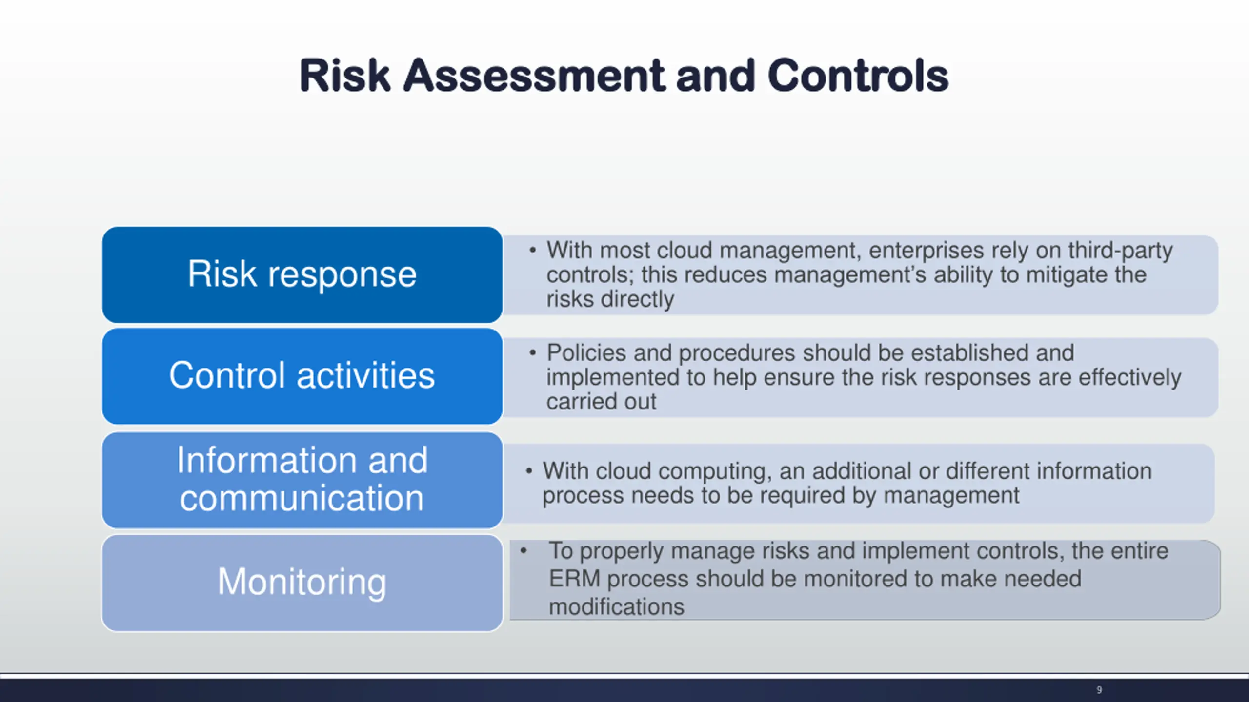 Risk Assessment and Controls Risk Assessment and Controls COSO ERM framework should be applied since it helps align the risk appetite of an enterprise with its control strategy. Internal Environment Internal Environment: tone of the organization Objective setting Objective setting: Management needs to evaluate how cloud computing aligns with the organization s objectives Event identification Event identification: With the use of cloud computing, management needs to consider external and internal environment factors Risk assessment Risk assessment: Management should evaluate risks associated with its cloud strategy 8