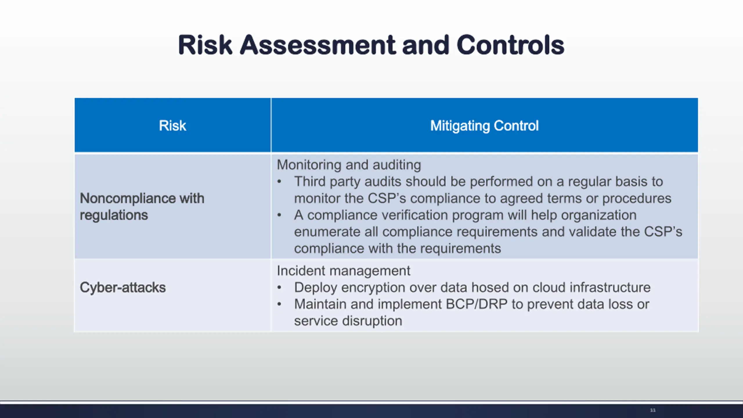 Risk Assessment and Controls Risk Assessment and Controls Risk Risk Mitigating Mitigating Control Control Data classification process and privacy controls Ensure that the purpose, ownership and sensitivity of this type of data are communicated and understood throughout the organization Enhance the effectiveness of data privacy controls Building strong relationship with CSPs and determining appropriate controls Obtain copies of the service provider SAS 70 or the SSAE 16 audit reports to confirm CSPs controls Perform due diligence on the selected service provider Management oversight and monitoring controls Board and senior management should have a precise understanding of the controls and determine the specific monitoring activities should implement Security and privacy Security and privacy Cloud service providers Cloud service providers Governance, management Governance, management and control and control 10