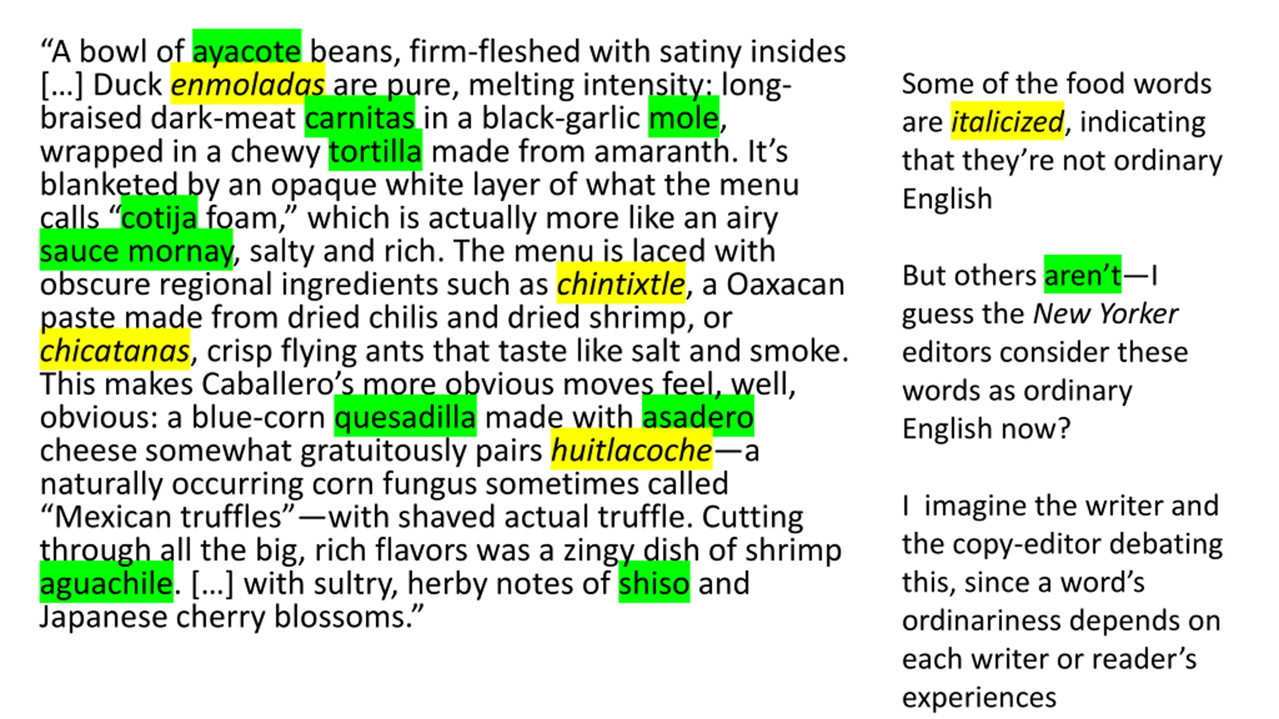 A bowl of ayacote beans, firm-fleshed with satiny insides [ ] Duck enmoladas are pure, melting intensity: long- braised dark-meat carnitas in a black-garlic mole, wrapped in a chewy tortilla made from amaranth. It s blanketed by an opaque white layer of what the menu calls cotija foam, which is actually more like an airy sauce mornay, salty and rich. The menu is laced with obscure regional ingredients such as chintixtle, a Oaxacan paste made from dried chilis and dried shrimp, or chicatanas, crisp flying ants that taste like salt and smoke. This makes Caballero s more obvious moves feel, well, obvious: a blue-corn quesadilla made with asadero cheese somewhat gratuitously pairs huitlacoche a naturally occurring corn fungus sometimes called Mexican truffles with shaved actual truffle. Cutting through all the big, rich flavors was a zingy dish of shrimp aguachile. [ ] with sultry, herby notes of shiso and Japanese cherry blossoms. Some of the food words are italicized, indicating that they re not ordinary English But others aren t I guess the New Yorker editors consider these words as ordinary English now? I imagine the writer and the copy-editor debating this, since a word s ordinariness depends on each writer or reader s experiences