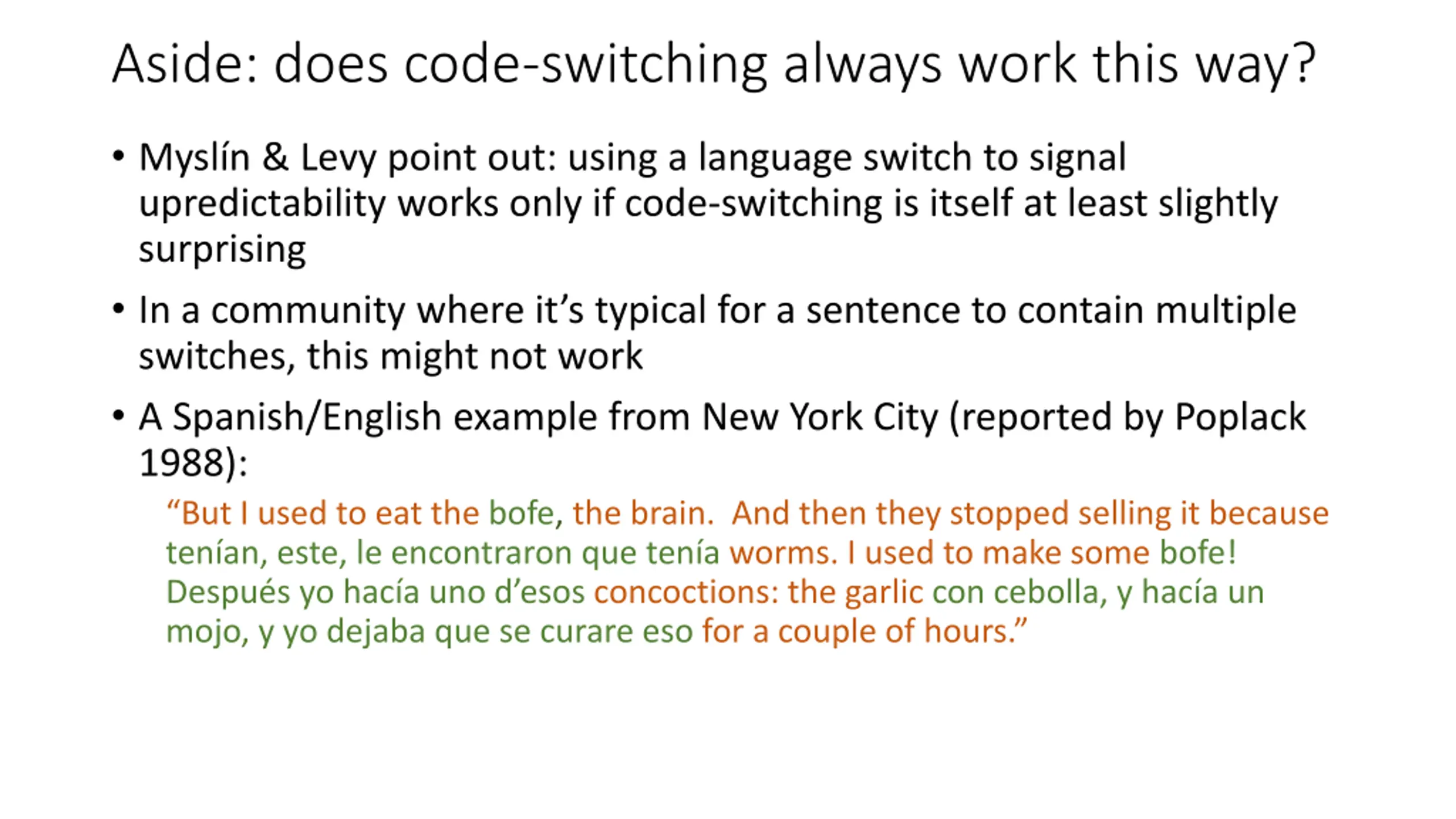 Aside: does code-switching always work this way? Mysl n & Levy point out: using a language switch to signal upredictability works only if code-switching is itself at least slightly surprising In a community where it s typical for a sentence to contain multiple switches, this might not work A Spanish/English example from New York City (reported by Poplack 1988): But I used to eat the bofe, the brain. And then they stopped selling it because ten an, este, le encontraron que ten a worms. I used to make some bofe! Despu s yo hac a uno d esos concoctions: the garlic con cebolla, y hac a un mojo, y yo dejaba que se curare eso for a couple of hours.