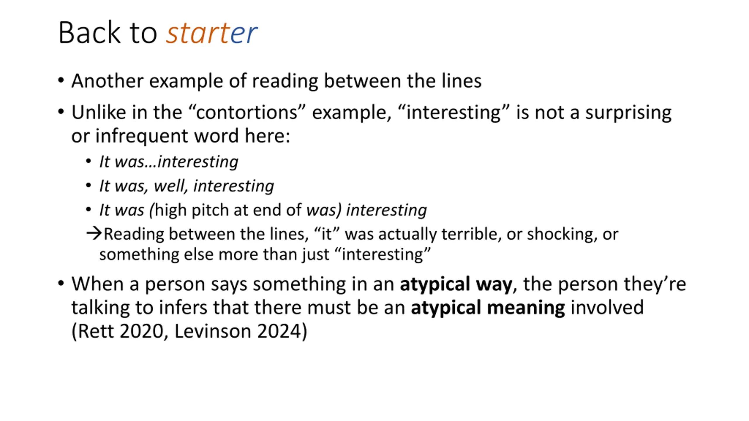 Back to starter Another example of reading between the lines Unlike in the contortions example, interesting is not a surprising or infrequent word here: It was interesting It was, well, interesting It was (high pitch at end of was) interesting Reading between the lines, it was actually terrible, or shocking, or something else more than just interesting When a person says something in an atypical way, the person they re talking to infers that there must be an atypical meaning involved (Rett 2020, Levinson 2024)