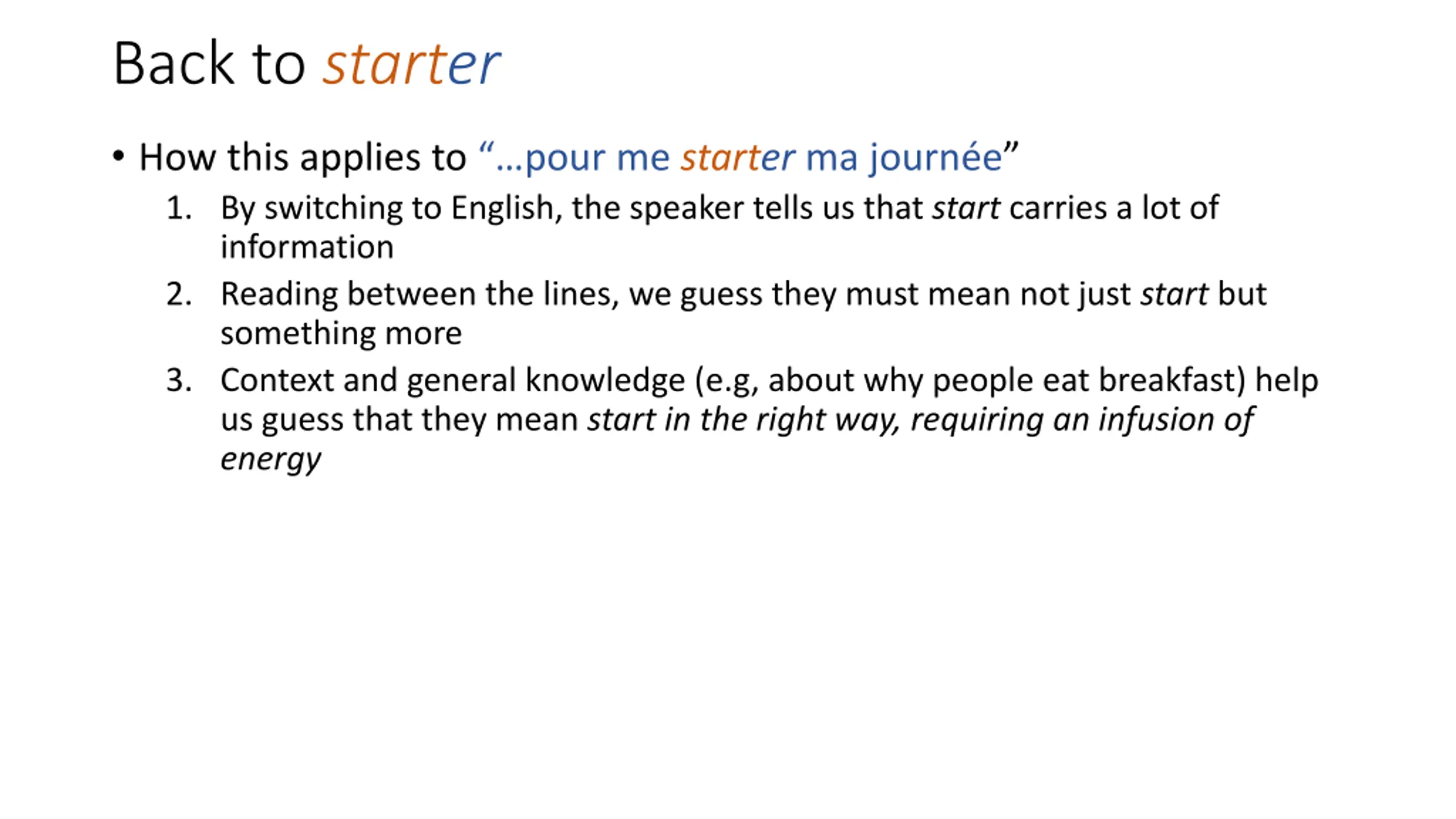Back to starter How this applies to pour me starter ma journ e 1. By switching to English, the speaker tells us that start carries a lot of information 2. Reading between the lines, we guess they must mean not just start but something more 3. Context and general knowledge (e.g, about why people eat breakfast) help us guess that they mean start in the right way, requiring an infusion of energy
